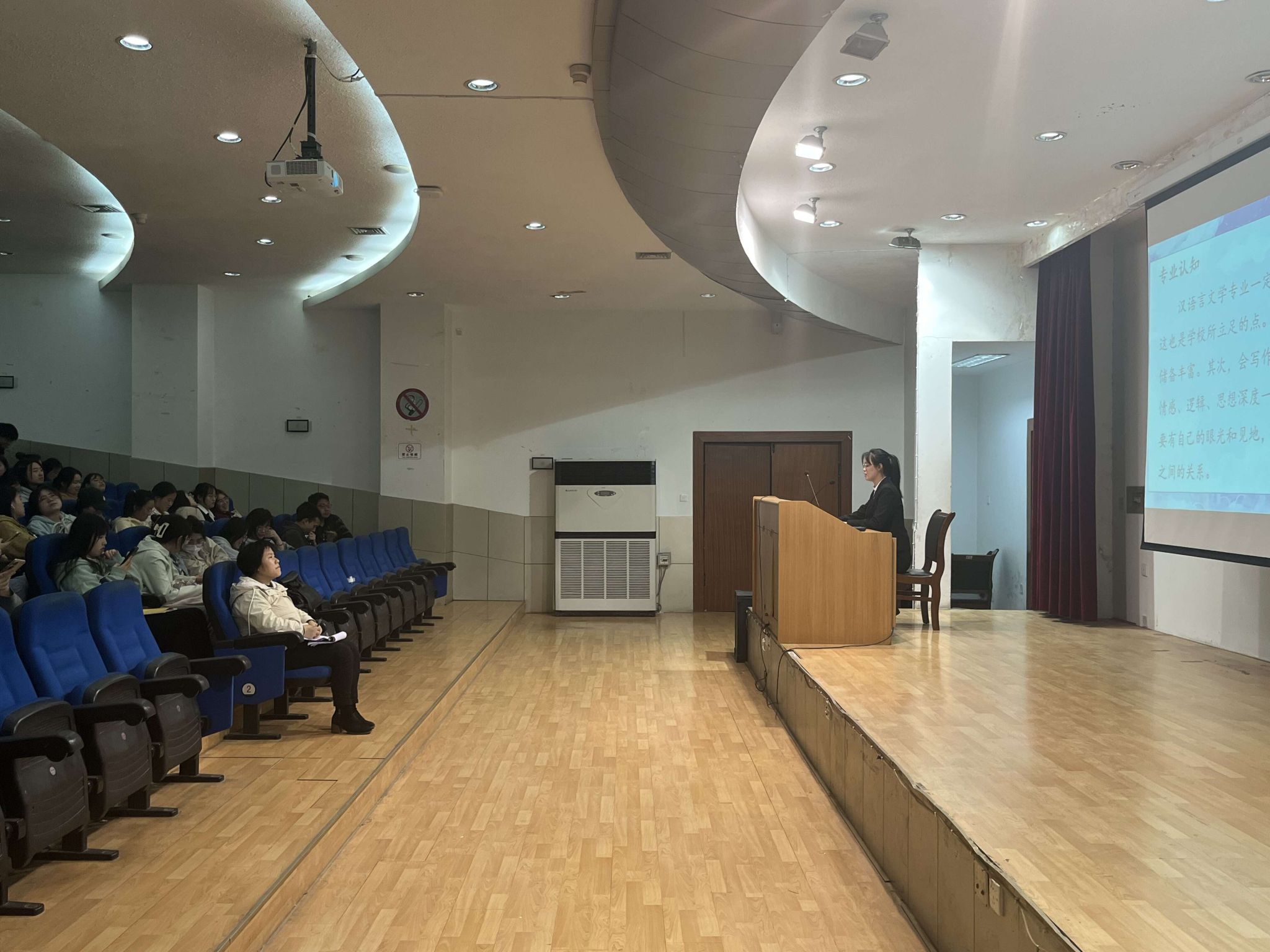 2023年4月7日晚上,SUNBET申博体育在江南校区一号楼报告厅组织召开“地方企业行业问题讲座”学习汇报会。汉语言文学系主任韩文霞及本专业2020级全体员工参会。