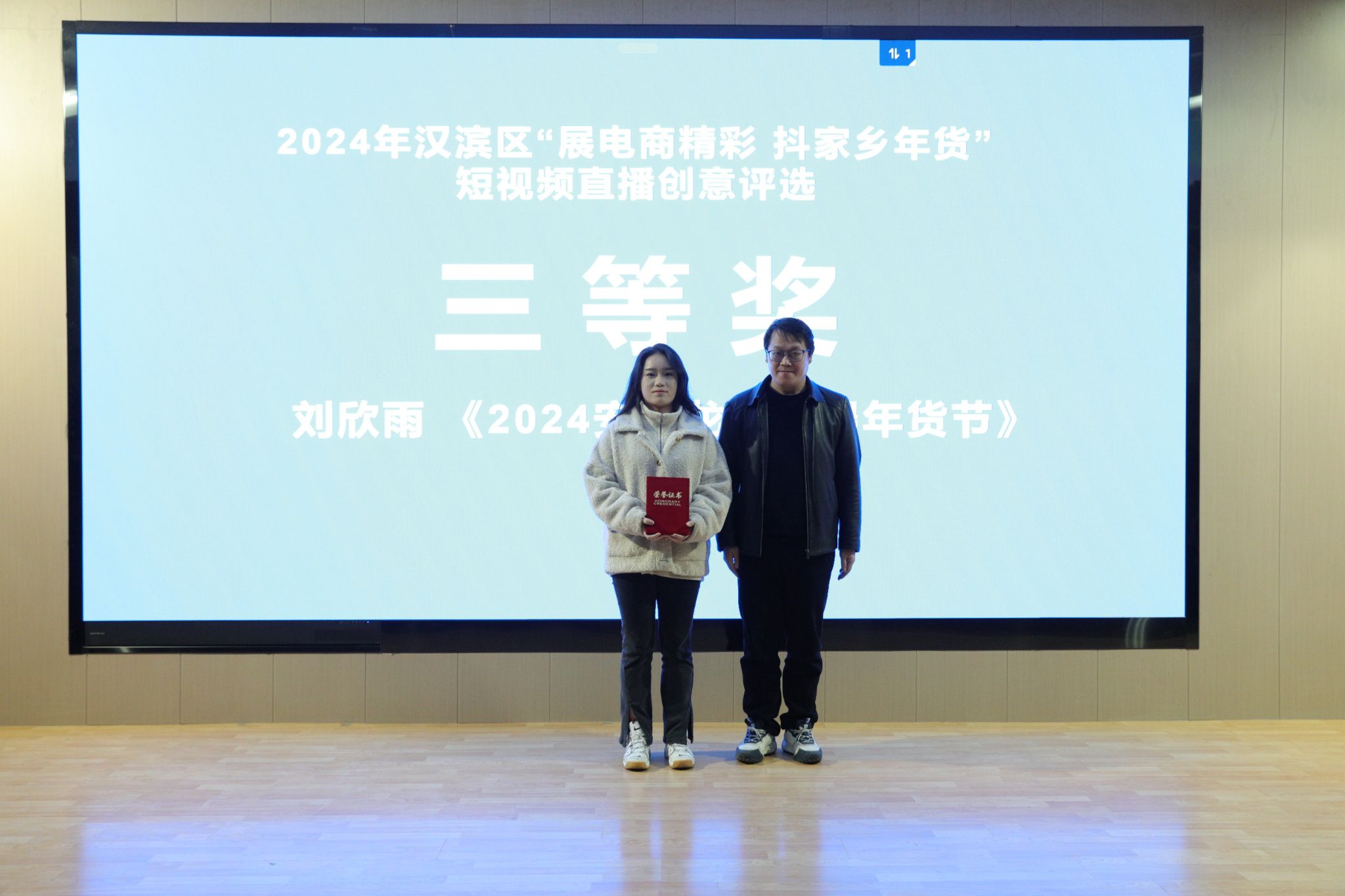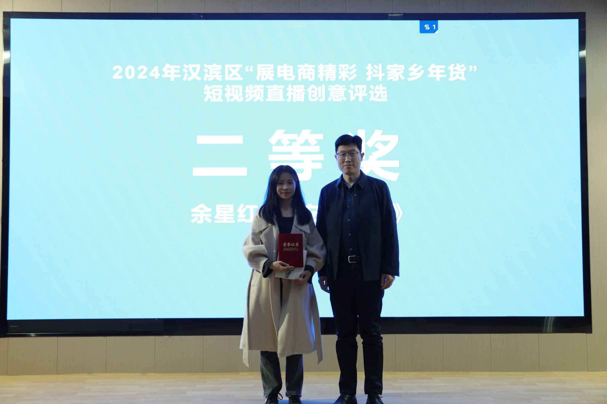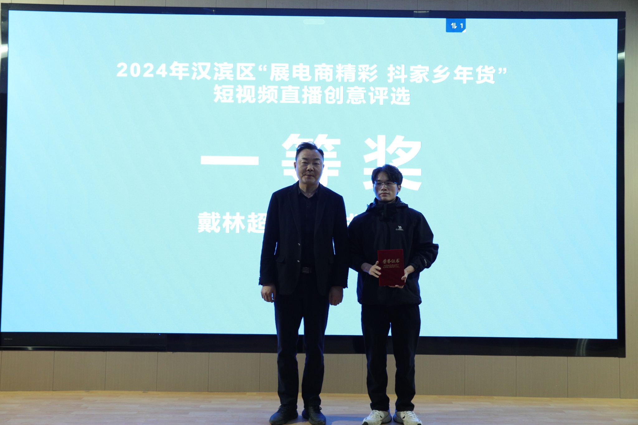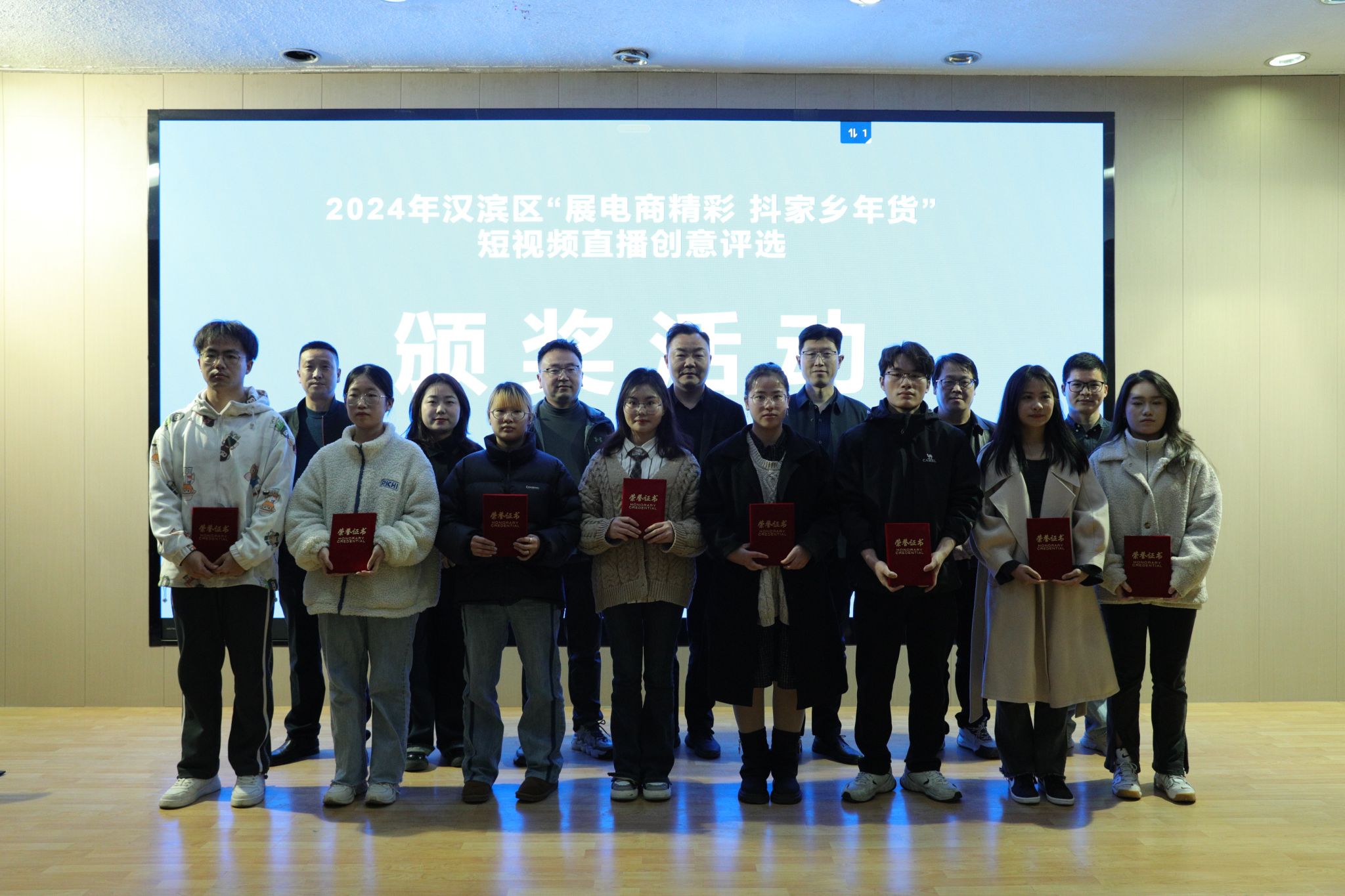 3月15日下午,公司与汉滨区电商中心联合举办的“展电商精彩,抖家乡年货”短视频竞赛在1605报告厅举行了大赛颁奖仪式。汉滨区电子商务服务中心主任李龙、汉滨区电子商务服务中心数字经济股股长张亮、安康市电子商务联合会负责人张铁汉、惟亚(上海)数字科技有限公司电商示范项目负责人李永瑶,感受到党总支书记芦伟、副经理朱云,秘书与新媒体系主任张建涛出席了颁奖活动。