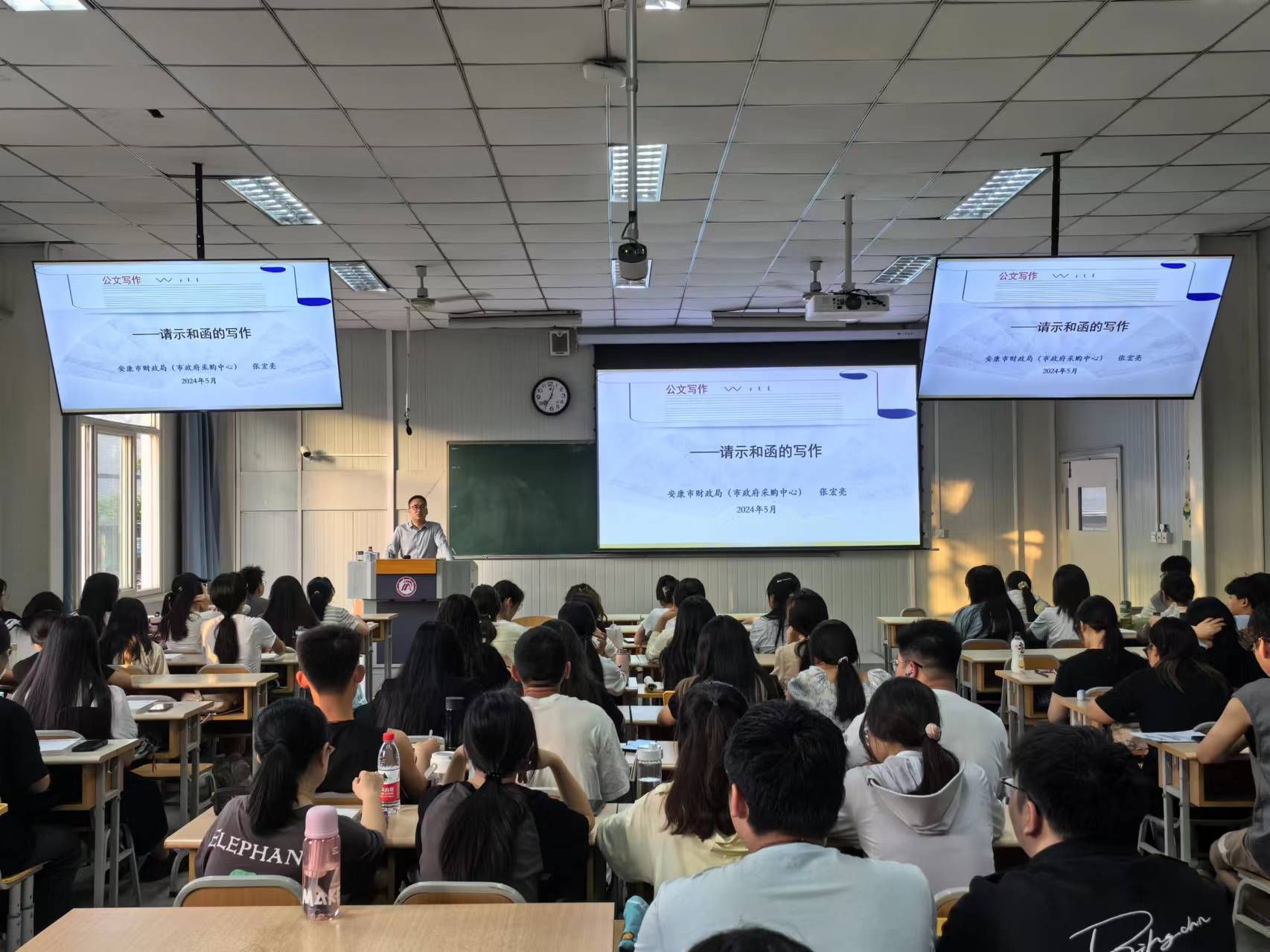 按照应用文写作“双师课程”教学计划,SUNBET申博体育分别于5月21日、28日和6月4日、11日、14日邀请课程安康市政府采购中心张宏亮为汉语言文学2023级1、2班员工讲授请示、批复、报告、函、纪要等公文和申论写作的技巧。校内任课教师胡少山随堂参与了授课。
