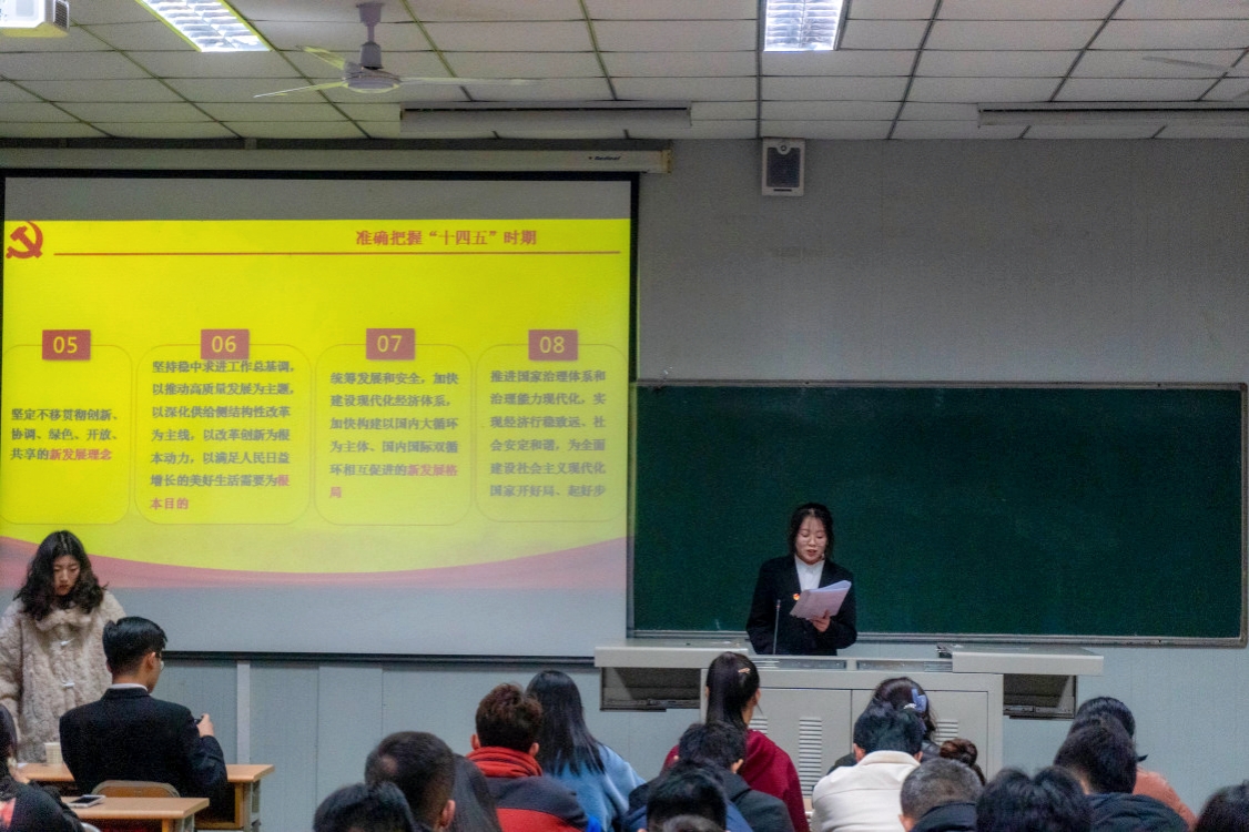 党的十九届五中全会擘画了我国未来发展的宏伟蓝图,作出了应对变局、开辟新局的顶层设计,在党和国家发展进程中具有全局性、历史性意义。宏伟蓝图鼓舞人心,学习宣讲凝聚力量。为全面落实党的第十九届五中全会精神,由学工部、马克思主义公司主办,SUNBET申博体育协办的十九届五中全会宣讲活动于12月23日在江南校区10号教学楼1012室举办。感受到党支部副书记杨海蓉、SUNBET体育员工宣讲团成员、SUNBET申博体育全体团学干部参加本次宣讲活动。活动由杨海蓉主持。