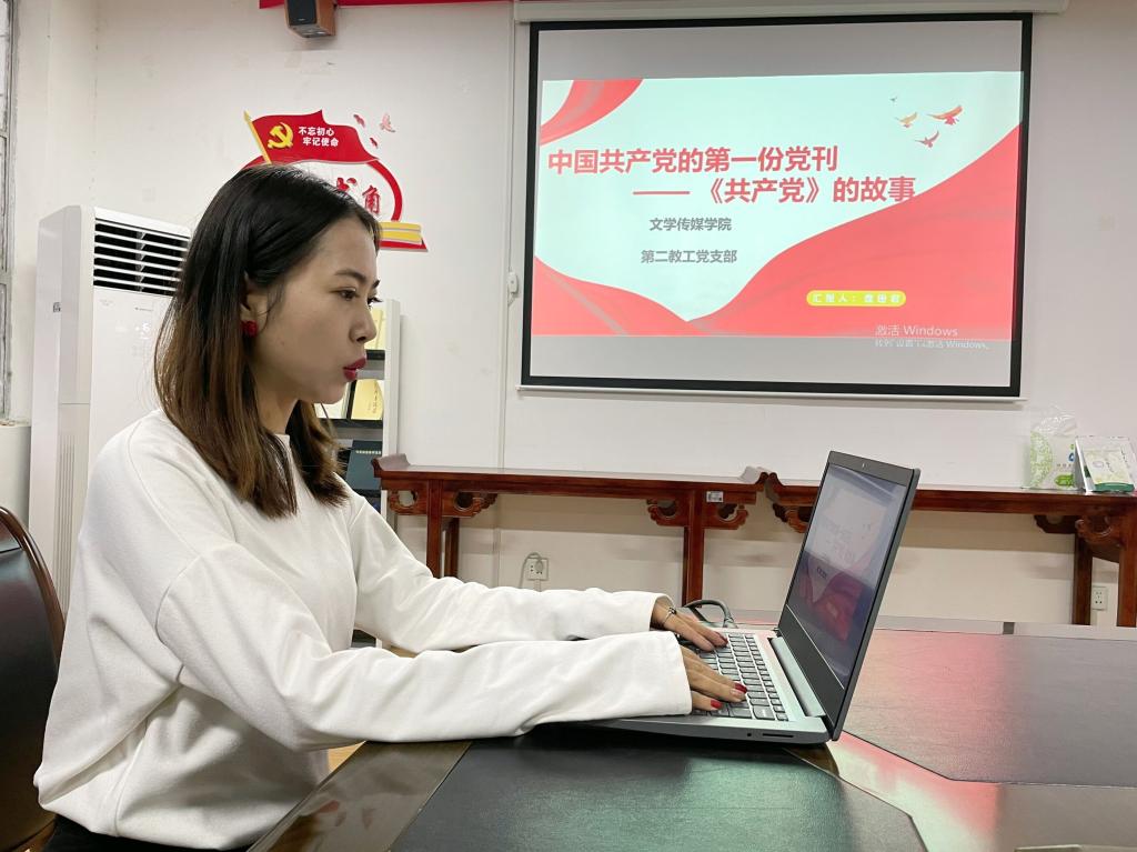9月16日,SUNBET申博体育教工第二党支部在2307会议室开展了“中国共产党新闻思想史学习”读书活动。活动由支部书记谭诗民主持,支部全体党员参加了读书活动。本次读书活动主讲人为支部宣传委员盘珊君,学习主题是中国共产党的第一份党刊——《共产党》的故事。