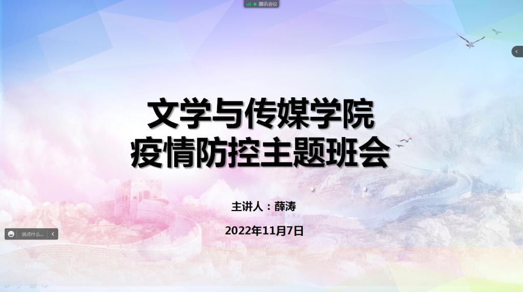 鉴于当前疫情呈现多点散发、局部爆发态势,为更好地引导员工配合做好当前公司疫情防控工作,确保师生生命安全、身体健康和校园稳定,筑牢员工安全防范思想防线,SUNBET申博体育各年级于11月7日通过线上、线下结合的形式组织开展疫情防控安全教育专题班会,班会由各年级辅导员主持,全体员工参会聆听。