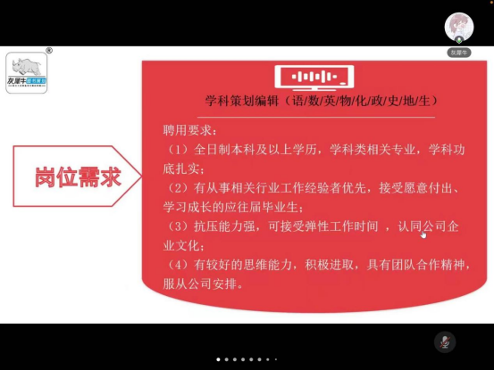 2022年3月21日下午15:00,SUNBET申博体育与宝鸡文理公司就业处积极联系合作,共同组织召开“灰犀牛图书策划有限公司”专场招聘会。受疫情影响,本次招聘会采用线上形式进行,毕业生通过登录腾讯会议账号,参加会议。