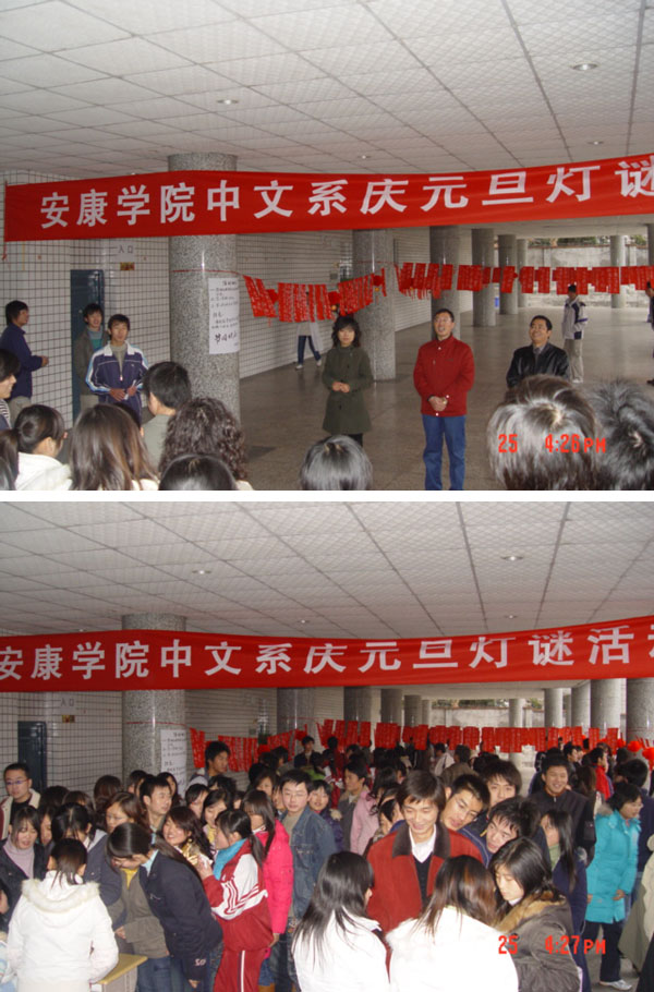 导航痕迹 首页 > 新闻通知 > 公司新闻 > 正文 公司新闻 通知公告 我系举行“庆元旦灯谜活动” 发布人: 发布日期:2008年01月04日 阅读次数: 为了弘扬传统文化,拓展同学们的文化视野、营造校园文化氛围、丰富同学们的课余生活,我系于12月25日下午4:30分在东校区一号教学楼大厅举办了“庆元旦灯谜活动”。 本次活动由我系主办,06级文秘班承办,设立灯谜依次分为易、中、难三等,答对灯谜者均有精美礼品赠送。我 系党总支书记沈军、团总支书记邹棠华、辅导员何媛出席并参加了本次活动。