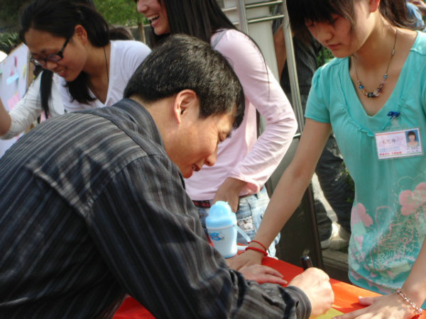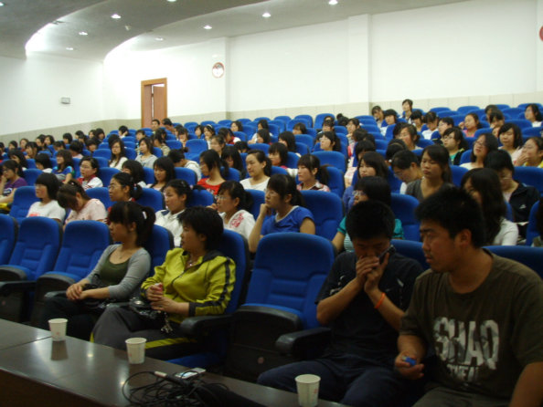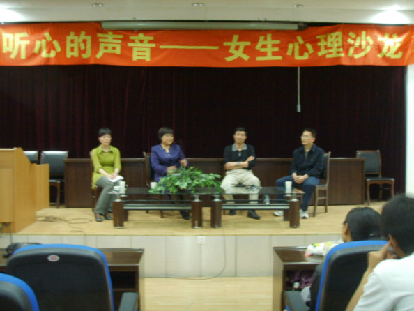 5月26日下午,在一号教学楼六楼报告厅,活动组织者以别开生面的形式举行了一场“女生心理沙龙”,邀请了中文系副教授王瑛老师,著名作家中文系副教授李春平老师,教科系王小康老师等嘉宾参加本次活动。中文系08级员工在沙龙上以互动的形式与几位老师展开心的交流。老师们生动幽默的语言,精彩传神的表演,使同学们在轻松愉快的环境中与老师们一起探讨当代女生存在的心理问题及老员工恋爱问题,让同学们了解了大量的心理知识,对本次沙龙也留下了深刻印象。