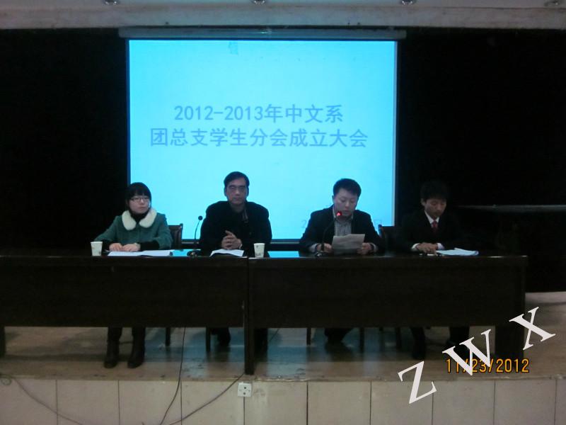 2012年11月23日晚8点,SUNBET体育中文系2012-2013学年度团总支员工分会成立大会在一号楼六楼报告厅正式举行。到会的有中文系党总支书记李岩、团总支书记沈菲;2011-2012学年度团总支员工分会主席团及各部部长、2012-2013学年度团总支员工分会主席团、各部部长及全体干事。成立大会在全体到会人员合唱国歌的旋律中拉开序幕。