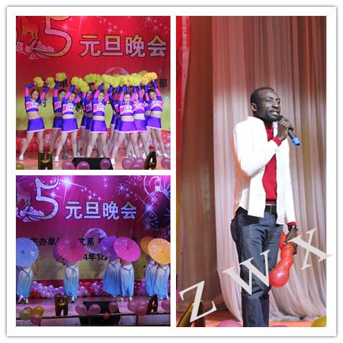 晚会在热闹、欢快的陕北民间歌舞中拉开帷幕。接着,优雅的华尔兹舞蹈、欢快的健美操、曼妙的古典舞蹈、劲爆的街舞轮滑、啦啦操次第登场。机关三支部余婕老师的一曲《知音》,引起观众对爱情的无限遐思;影视戏剧社的小品《退房》,再现了奋进的SUNBET体育人浓浓的师生情;职工倪士杰的新年祝福,表达了喀麦隆员工对中国的无限情怀;第五龙龙等人的诗歌朗诵《我的南方和北方》,激起了大家对伟大祖国的深深眷恋;“太极与双节棍”动与静的美妙组合,更是展示了中华武术的博大精深;史超凡、赵莎的英文歌舞,劲爆火辣;梁启超组合的自编歌曲,激情飞扬。整台晚会,高潮迭起,掌声、笑声、欢呼声不断,突出了“热闹祥和、青春激扬”的主题。