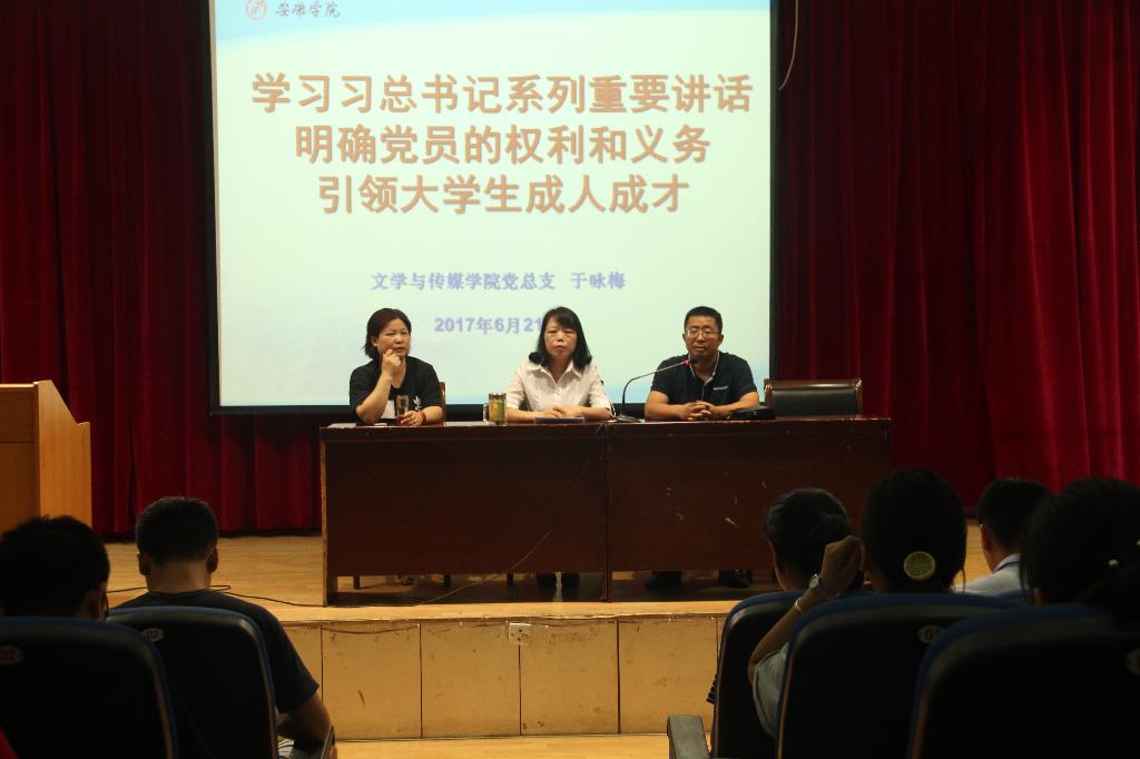 为庆祝建党96周年,扎实推进“两学一做”学习教育常态化制度化,2017年6月21日下午,感受到党总支书记于咏梅为SUNBET申博体育全体员工党员、发展对象、入党积极分子讲了以“学习习近平总书记系列重要讲话,明确党员的权利义务,引领老员工成人成才”为题的党课。党总支组织委员邹棠华、员工党支部支委郝礼军、艾全霞参加了党课学习,本次党课由邹棠华主持。