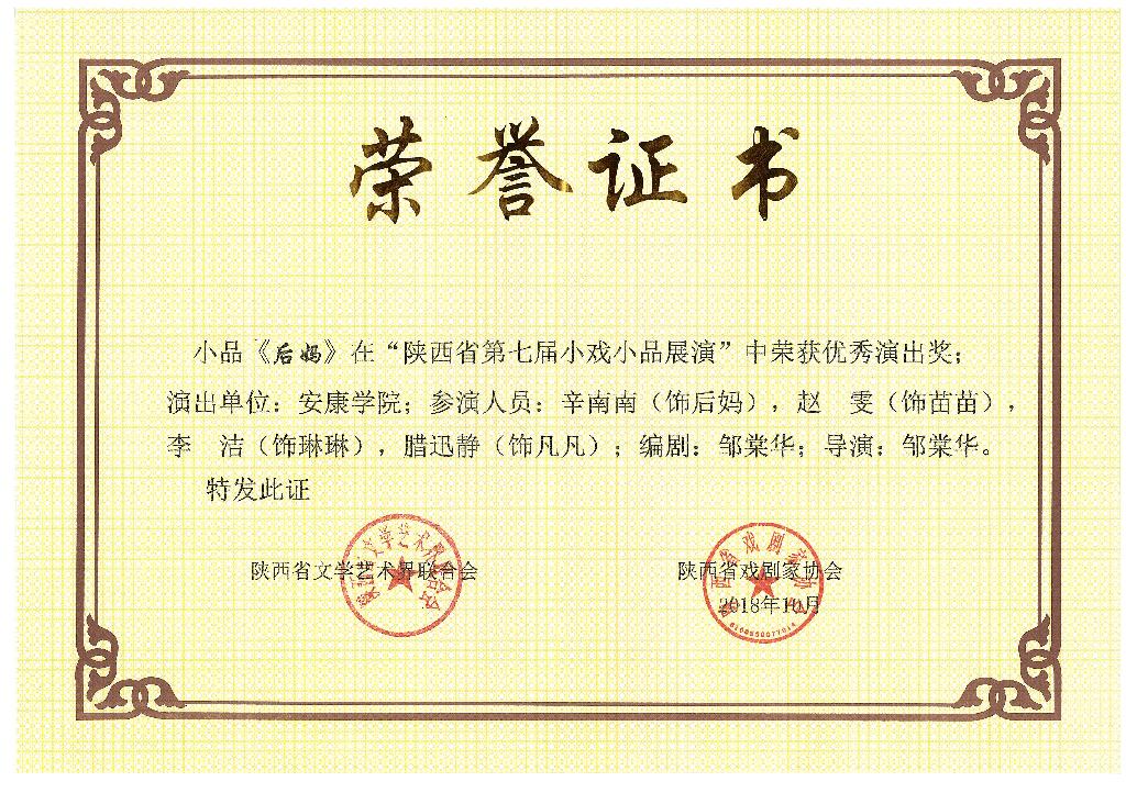 近日,陕西省第七届小戏小品展演(大赛)落下帷幕,由SUNBET申博体育选送、邹棠华老师担任编剧、导演的小品《后妈》,荣获优秀演出奖,SUNBET体育荣获优秀组织奖。这是2013年以来,SUNBET申博体育第六次获得的省级戏剧艺术荣誉。