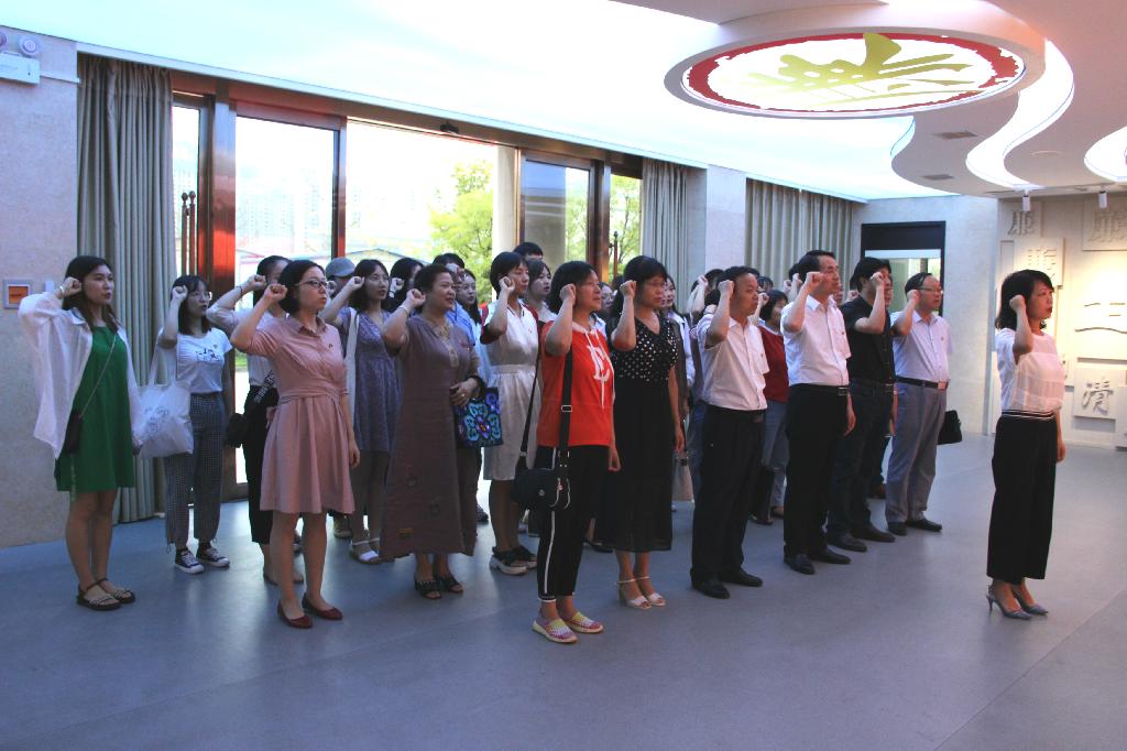 参观学习结束后,师生党员在基地主体大厅面对党旗,重温入党誓词。在公司党总支书记于咏梅同志领誓下,王国良同志和SUNBET申博体育师生一起举起右拳,庄严宣誓。