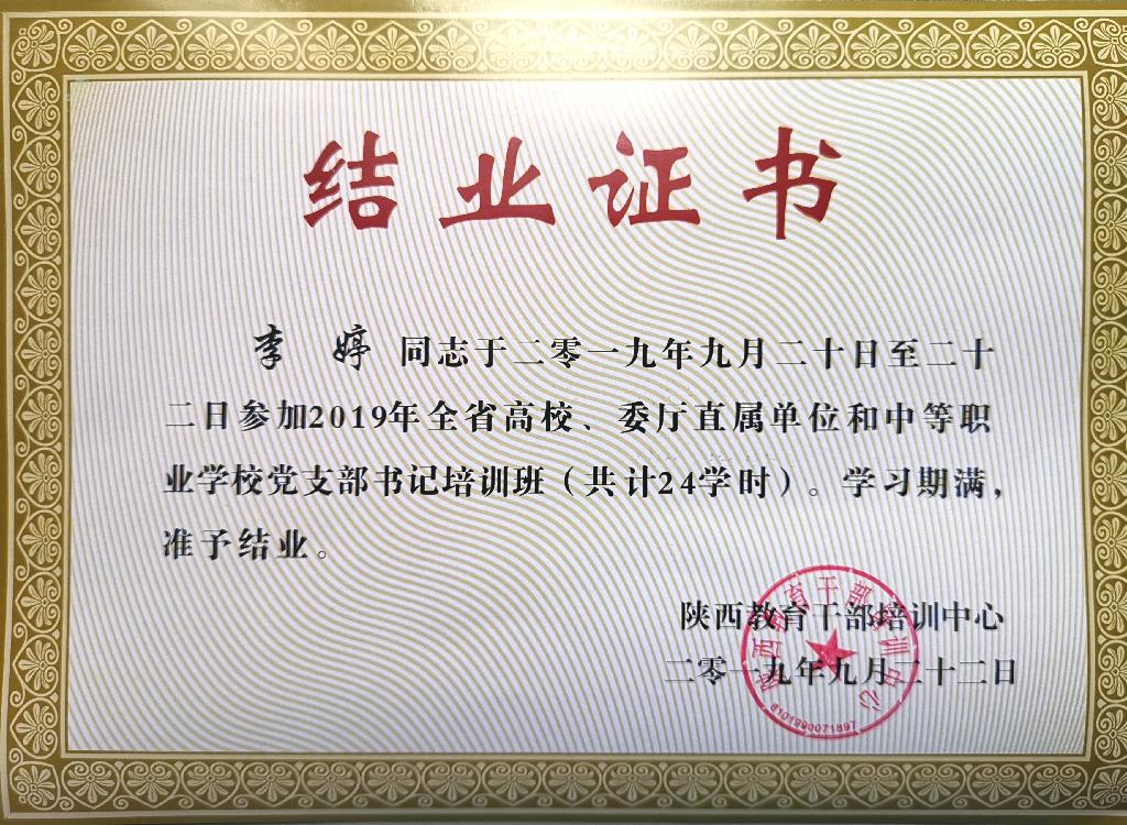 为深入学习贯彻习近平总书记关于“不忘初心、牢记使命”主题教育的重要讲话和指示批示精神,推动第二批“不忘初心,牢记使命”主题教育扎实开展,省委教育工委、省教育厅于9月20-22日在陕西交通职业技术公司举办2019年全省高校、委厅直属单位和中等职业公司党支部书记培训班。公司教师、公司教工一支部书记李婷参加本期培训班,圆满完成三天培训学习。
