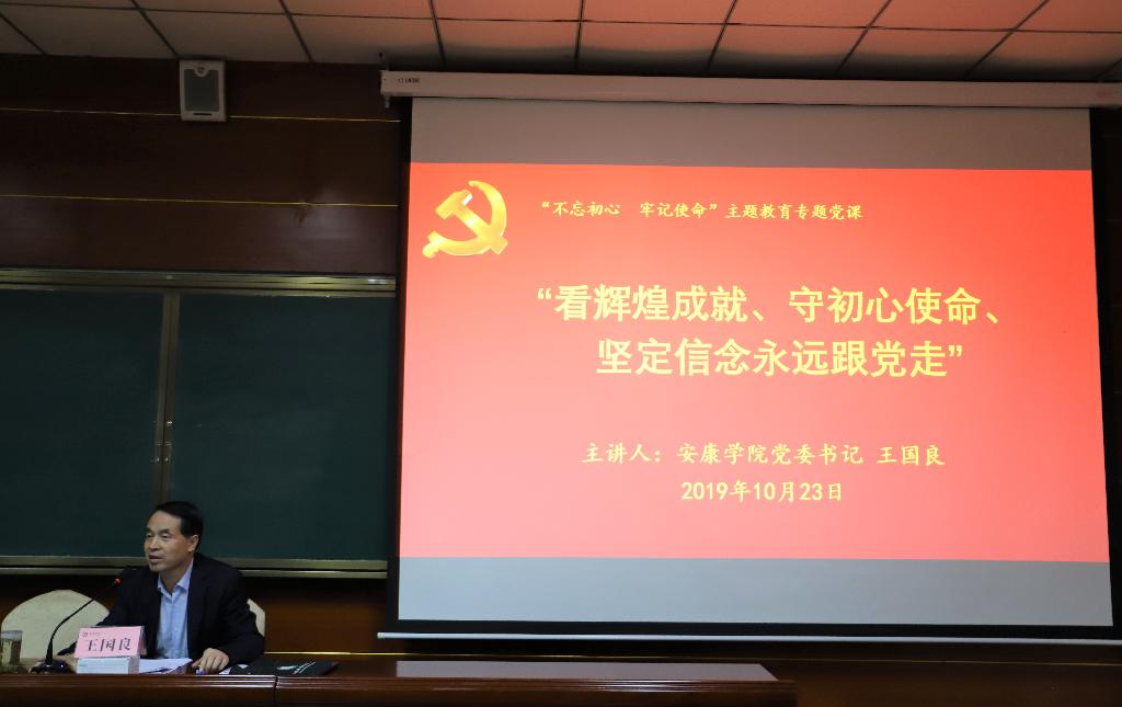王国良在专题党课上要求公司党员师生尤其是党员领导干部要充分认识新中国70年取得的辉煌成就,切实讲好、宣传好中国共产党史、新中国史和改革开放史,坚定马克思主义信仰和中国特色社会主义道路信念;要进一步强化理论武装,静下心来、认认真真、原原本本地读原著、学原理,学懂弄通习近平新时代中国特色社会主义思想,树牢“四个意识”坚定“四个自信”,坚决做到“两个维护”;要坚守为党育人、为国育才的初心使命,全面贯彻党的教育方针,落实好立德树人的根本任务;要不断深化公司产品改革,努力提升人才培养质量,不断完善内部治理体系;要坚持内涵式发展,坚持特色办学,坚持依法治校,积极推进公司“转型发展、提升层次”两大战略任务,切实办好人民满意的高等教育,坚定不移跟党走、听党话,同全国人民一道,为实现两个一百年奋斗目标和中华民族伟大复兴的中国梦而努力奋斗。