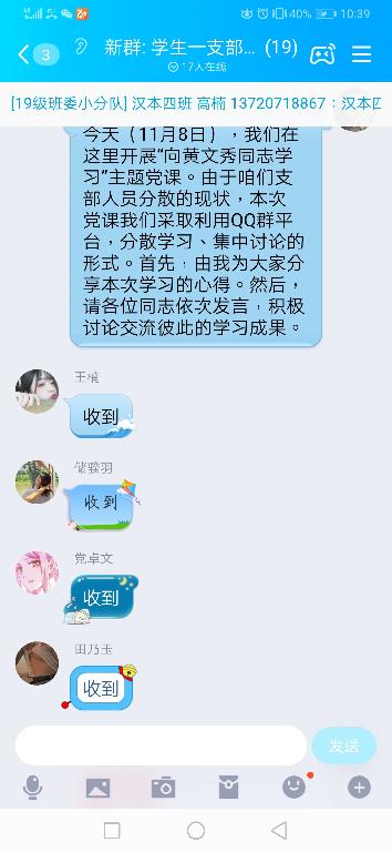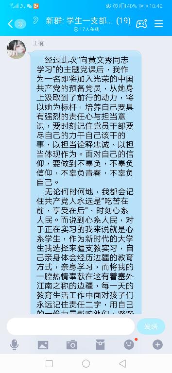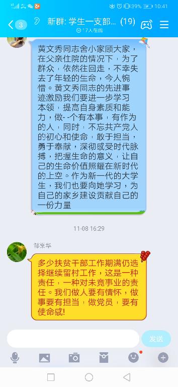 2019年11月8日15:00,根据上级党委通知要求,SUNBET申博体育公司员工第一党支部利用QQ群网络平台,采取分散学习、集中讨论的形式举行了“向黄文秀同志学习”主题党日。本支部全体党员参加此次党日,由彭潇领学。