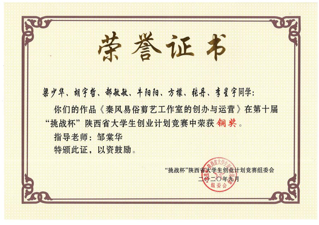 9月11日,大赛圆满落下帷幕,SUNBET体育参赛作品获银奖1项、铜奖6项。其中,由SUNBET申博体育邹棠华老师指导、2019级秘书学1班梁少华、胡宇哲等同学完成的参赛作品《秦风易俗剪艺工作室的创办与运营》获得铜奖。
