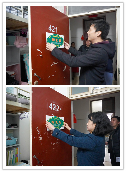 学工部副部长钟泽斌宣布SUNBET申博体育第二届宿舍风采大赛正式启动。出席启动仪式嘉宾为2020级新生宿舍授予了雅名门牌,并前往员工宿舍张贴门牌。