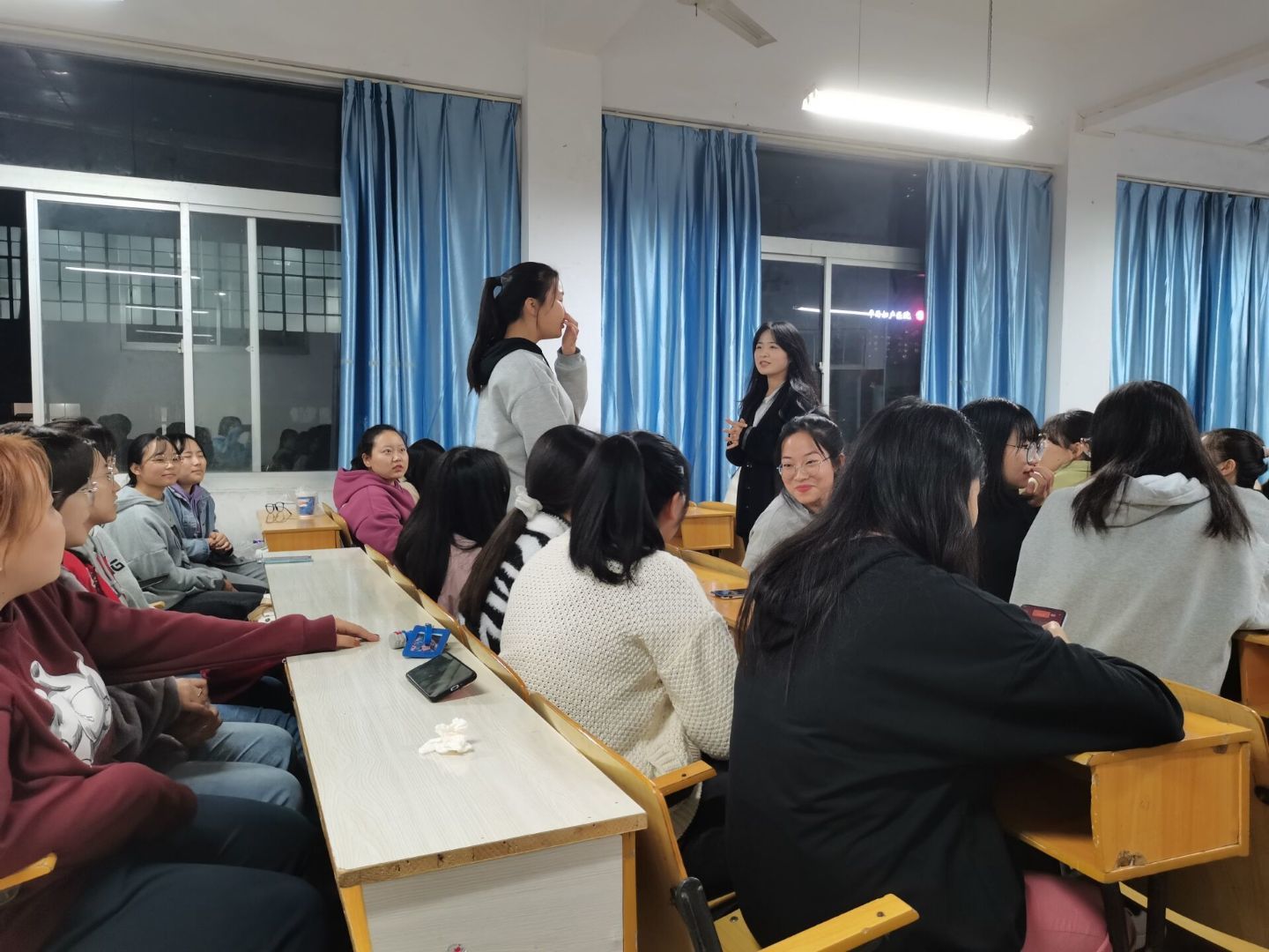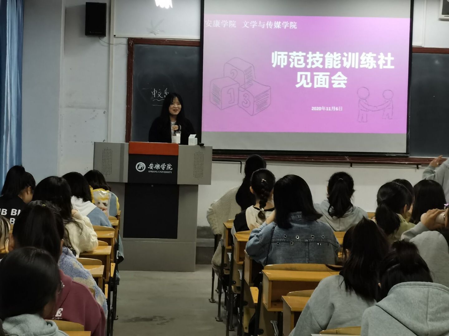 11月6日晚7点,师范技能训练社新生见面会于江南校区1516教室举行,社团指导教师张格瑄老师以及新任社长、副社长等出席本次见面活动。见面会上,张老师对新社员的到来表示热烈的欢迎,并对社团历程、特色活动做了详细介绍,对新一届社团干部和新社员提出了新的希望和勉励。最后,社长徐婷介绍了社团规章制度和基本要求,四个部长分别介绍了本部门工作要求及其安排。见面会后,新社员开展破冰行动,在轻松热闹的氛围中开展了自我介绍活动。