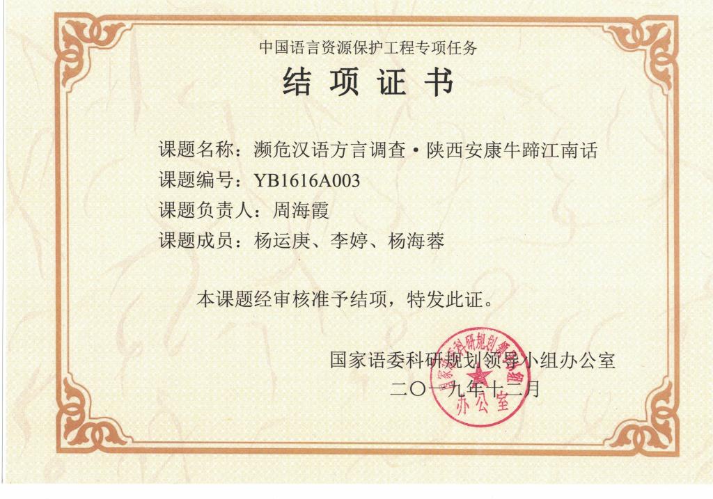 导航痕迹 首页 > 新闻通知 > 公司新闻 > 正文 公司新闻 通知公告 公司教师周海霞主持的中国语言资源保护工程重点专项项目顺利结题 发布人: 发布日期:2020年10月28日 阅读次数: 公司教师周海霞主持的中国语言资源保护工程重点专项项目“濒危汉语方言调查·陕西安康牛蹄江南话”顺利通过结题验收,音频、视频、文字资料全部合格并收入中国语言资源库。 “濒危汉语方言调查·陕西安康牛蹄江南话”项目2016年4月正式被国家语委科研规划领导小组办公室立项,到账经费18万元,牛蹄江南话也是本批中国语言资源保护工程项目确定列入的陕南范围内的唯一一个濒危汉语方言保护调查点。本项目研究历时三年六个月,项目成果录制音频、视频资料各3828条,收集方言民俗照片100余幅,形成方言志书文字材料30余万字。 撰稿/周海霞 审核/杨运庚 发布/崔瑜