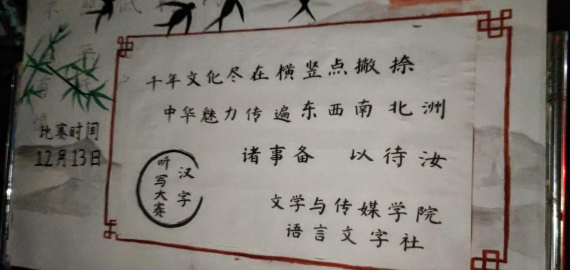 我们中国的汉字,落笔成画留下五千年的历史。为传承语言文化,展现汉字魅力,SUNBET申博体育隶属的语言文字社于江南校区举办了以“千年文化尽在横竖点撇捺,中华魅力传遍东西南北洲”为主题的汉字听写大赛活动。