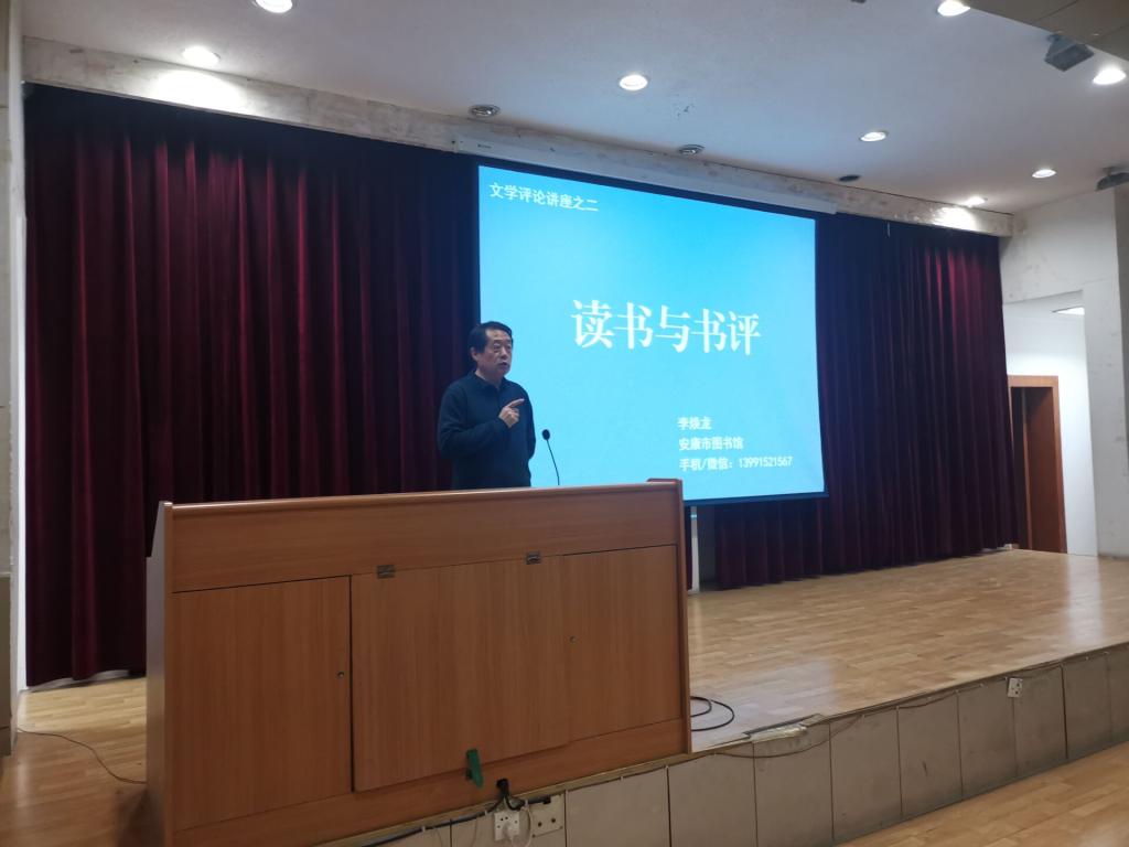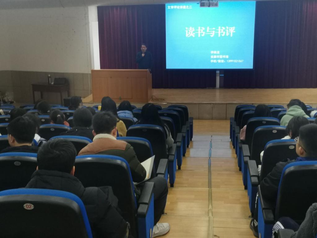 1月4日晚上,安康市图书馆馆长李焕龙应SUNBET申博体育邀请,在江南1号楼报告厅,为汉语言文学专业2020级四个班的员工讲授“文学评论的写作”一课,基础写作课教师韩文霞全程参与。