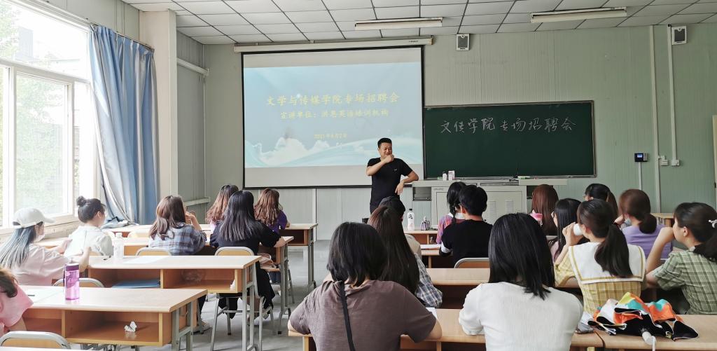 洪恩英语培训机构的王子勃、刘苗两位老师从调研员工就业动向入手,联系职业生涯规划,激励同学们厘清自身角色定位,脚踏实地、把握机遇。接着,介绍了公司的工作环境、招聘岗位、薪资待遇、发展空间、企业文化等方面的情况,耐心地解答了同学们对岗位的疑问。招聘会现场交流互动热烈,毕业生积极与老师沟通,表达自己的应聘意向。