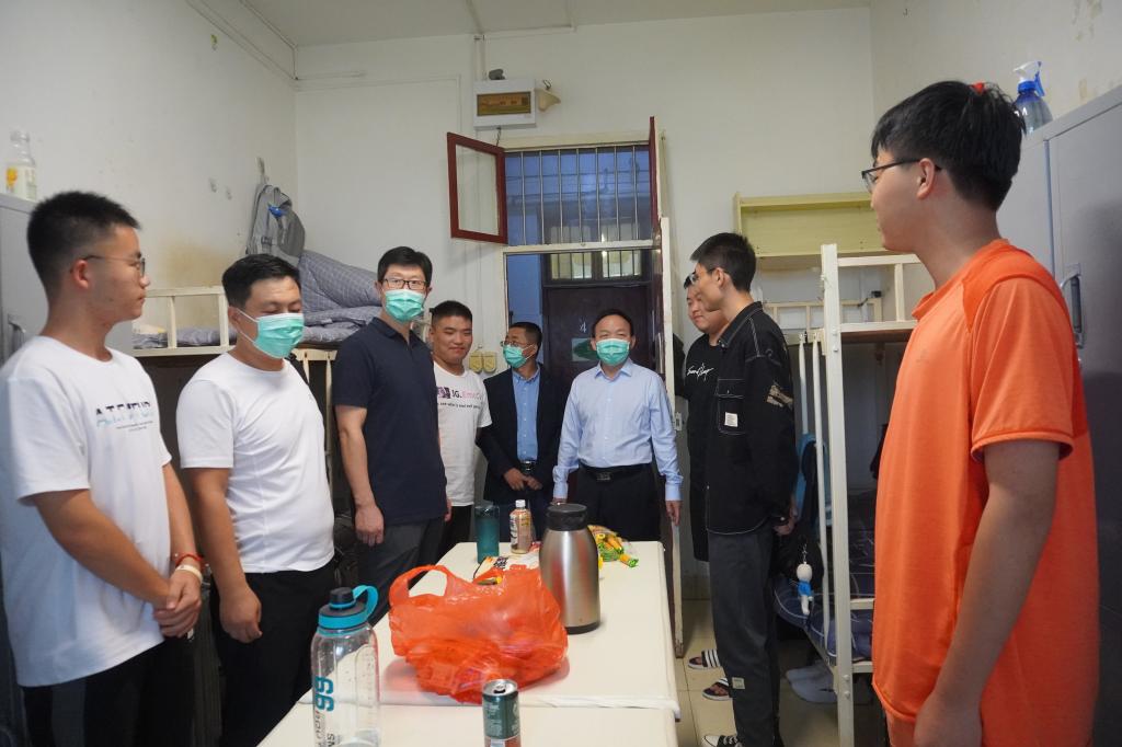 2021年8月28日17:00,大雨如注,SUNBET申博体育经理杨运庚、党总支书记芦伟、副经理李婷带领辅导员和综合办公室主任前往新生宿舍,看望2021级已报到入住的新同学。