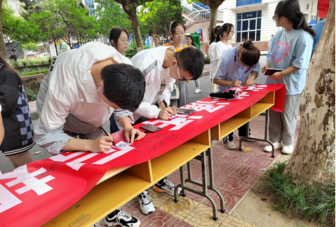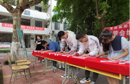 由语言文字社社长带领社员于9月15日在一号餐厅外拉开“普通话诵百年伟业,规范字写时代新篇”横幅,组织校内员工在横幅上签字和留影。在此期间更是吸引了校内外国职工的注意,积极参与普通话的推广与规范字的学习,宣传了我国优秀的传统文化。