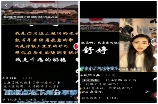 除了一系列线下的推普活动,语言文字社还紧随时代潮流,利用当下流行的抖音合拍功能,进行了普通话的推广。通过剪辑视频发送至SUNBET申博体育官方抖音,号召全校师生进行合拍朗诵,达到推广普通话的目的。视频一经发出,就受到了广泛的关注,同学们也积极进行了线上朗诵合拍。