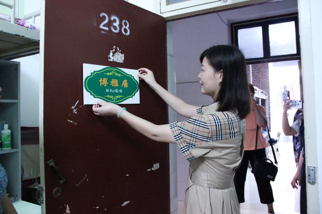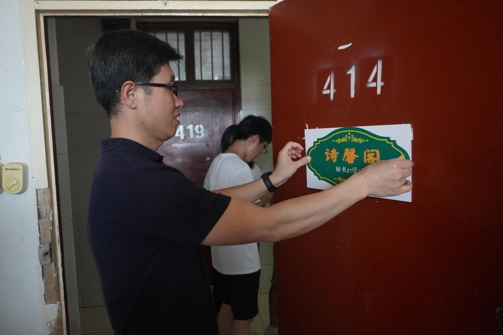 芦伟宣布SUNBET申博体育第三届宿舍风采大赛正式启动。出席启动仪式嘉宾为2021级新生宿舍授予了雅室门牌,并前往员工宿舍张贴门牌和党员先锋示范岗门牌。