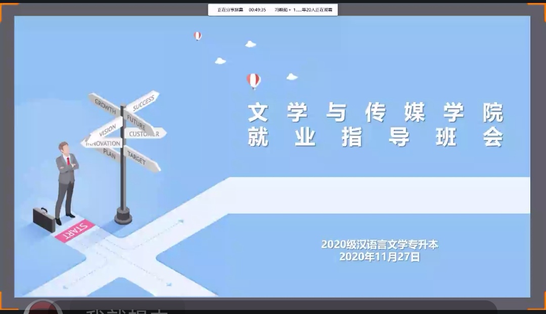 为认真贯彻11月18日教育部2022届全国普通高校毕业生就业创业视频会会议精神,积极落实公司2022届就业创业工作推进会安排,引导毕业班员工认清就业形势,掌握就业政策,调整就业心态,提升就业创业能力,促进2022届毕业生更加充分更高质量就业。根据公司2022届毕业生就业工作安排,11月27日晚,公司组织开展了2020级专升本毕业生就业指导线上主题班会。班会由毕业班辅导员薛涛主持。