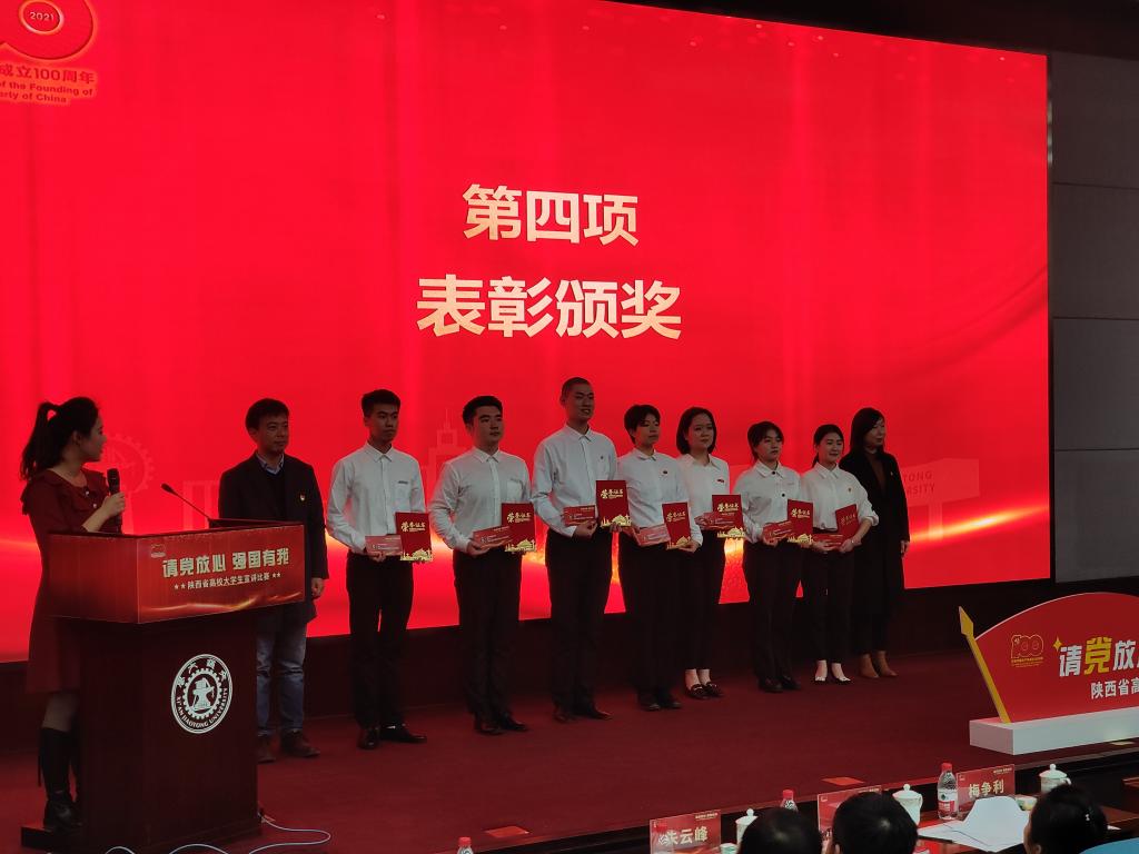 当日下午3点,现场总决赛暨颁奖典礼在西安交通大学科技厅正式开始。活动现场播放了选手展示视频,来自西安交通大学、陕西师范大学、长安大学等高校的9名选手依次登台宣讲,现场角逐特等奖和一等奖。比赛半场,其余在决赛中脱颖而出的我省各高校的优秀宣讲人为大家带来集体诗朗诵《青春中国》,将比赛氛围推向高潮。公司员工杨钰宣讲题目为 《志在千秋,梦在前》,结合自身疫情期间的两次志愿者经历,讲述了中国历代优秀青年心系祖国、服务人民的精神;郭杨宣讲题目为《以青春之名,谱写时代华章》,通过讲述山东省泗水县苗馆村党支部书记助理吴天洋的事迹,展示了一代代中国青年奋斗不息、奉献不止的伟大精神。在最终的评审中,两人均荣获二等奖。