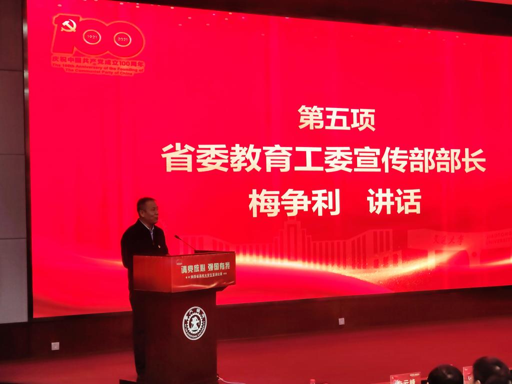 比赛最后,陕西省委教育工委宣传部部长梅争利作了总结讲话,他首先对获奖选手表示了祝贺,并在讲话中指出本次宣讲比赛效果良好、意义重大,“请党放心,强国有我”不仅是青年对党的深情表白,同时也是党对青年的殷切期望,广大青年应肩负责任和历史使命,加强理论学习,提升宣讲能力,进一步发挥作用,让“请党放心,强国有我”的誓言响彻三秦大地。