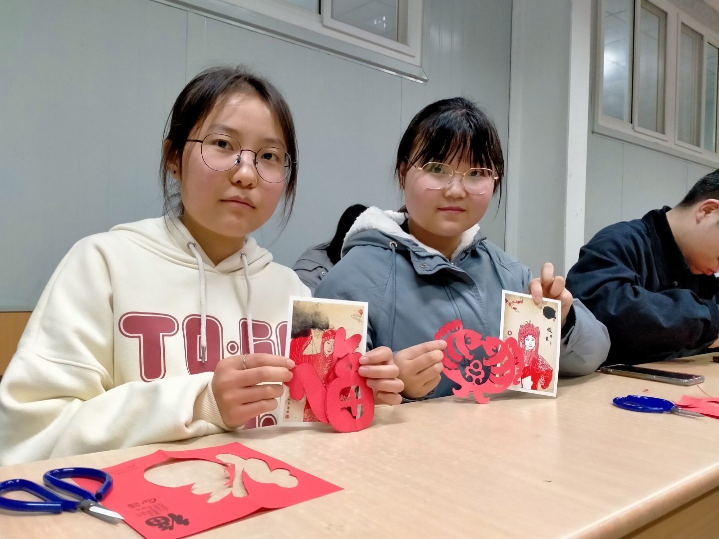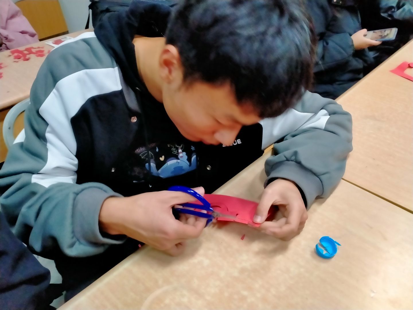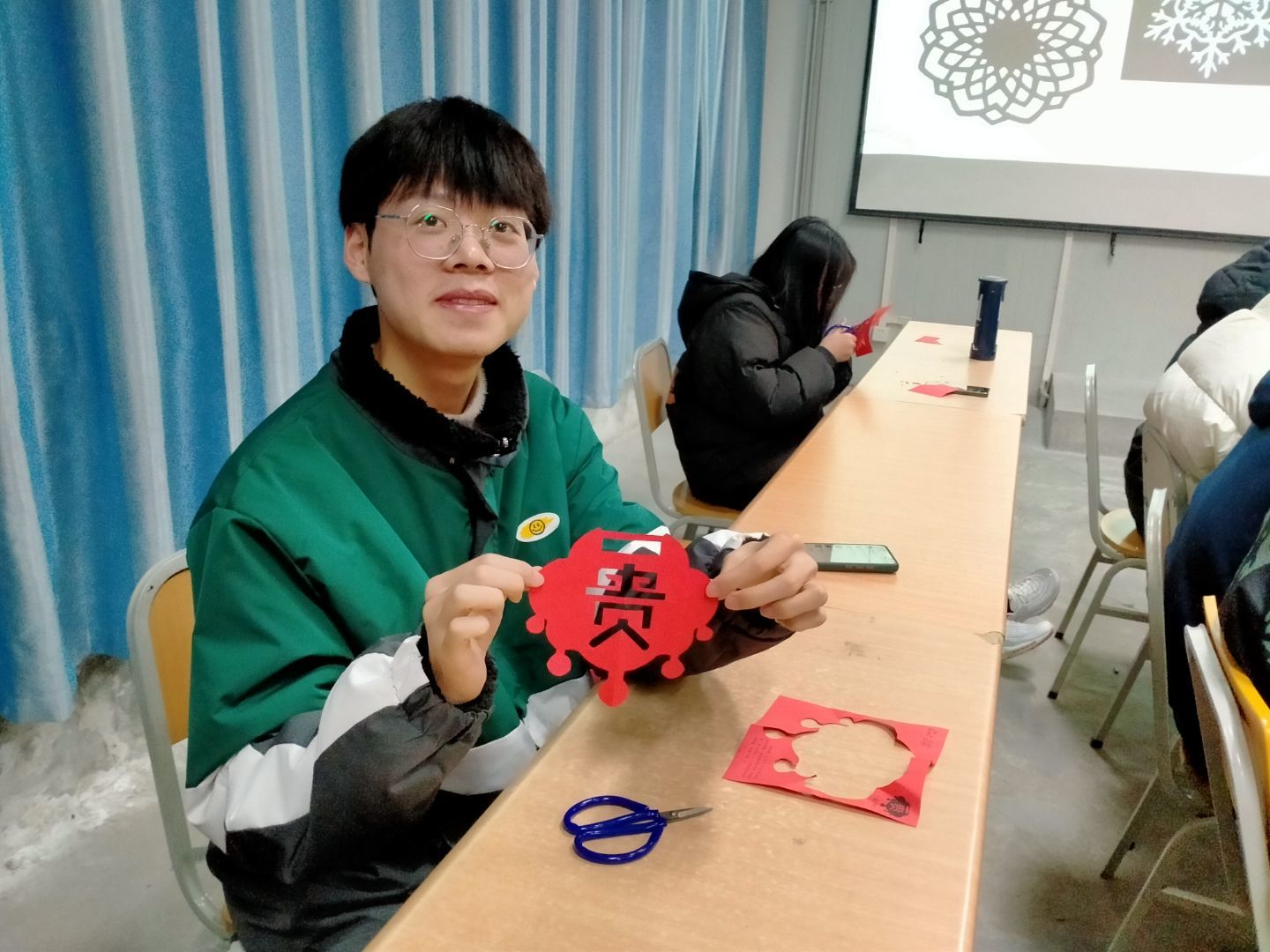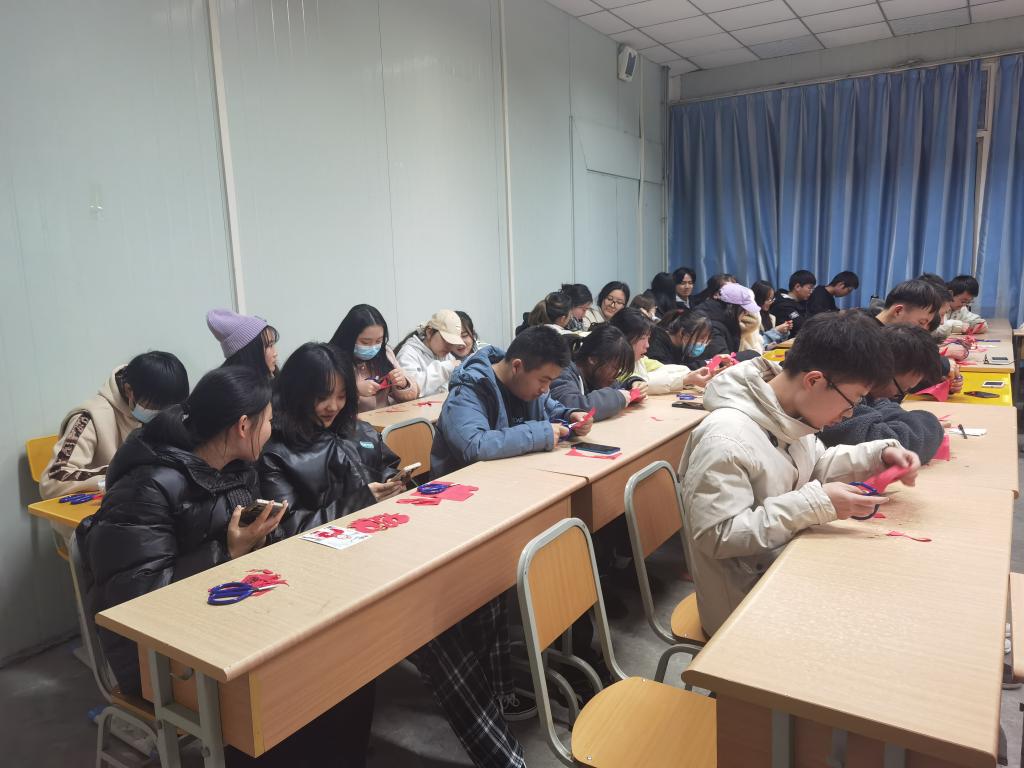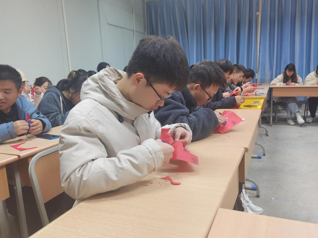 接下来,同学们拿起了剪刀和剪纸,在梁少华的指导下开始了剪纸艺术创作过程。在剪纸环节中,每当同学们遇到问题,梁少华都会积极耐心地帮助他们解决,给同学指导正确的方法。现场氛围十分热烈。整个剪纸过程,同学们对剪纸都怀抱极大兴趣并乐在其中,接连剪出了许多精致的作品。