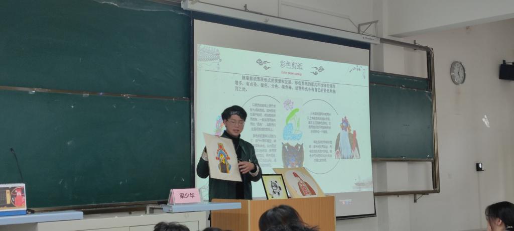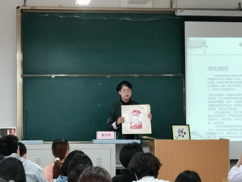 活动现场,梁少华为同学们介绍了非遗文化,从非遗的概念和非遗的时代性两个方面展开阐述,通过传统剪纸作品展示和新式剪纸作品展示让同学们直观地欣赏到剪纸艺术。梁少华指导现场参与的同学进行剪纸实践,感受剪纸魅力,并相互进行作品点评,交流剪纸感悟。