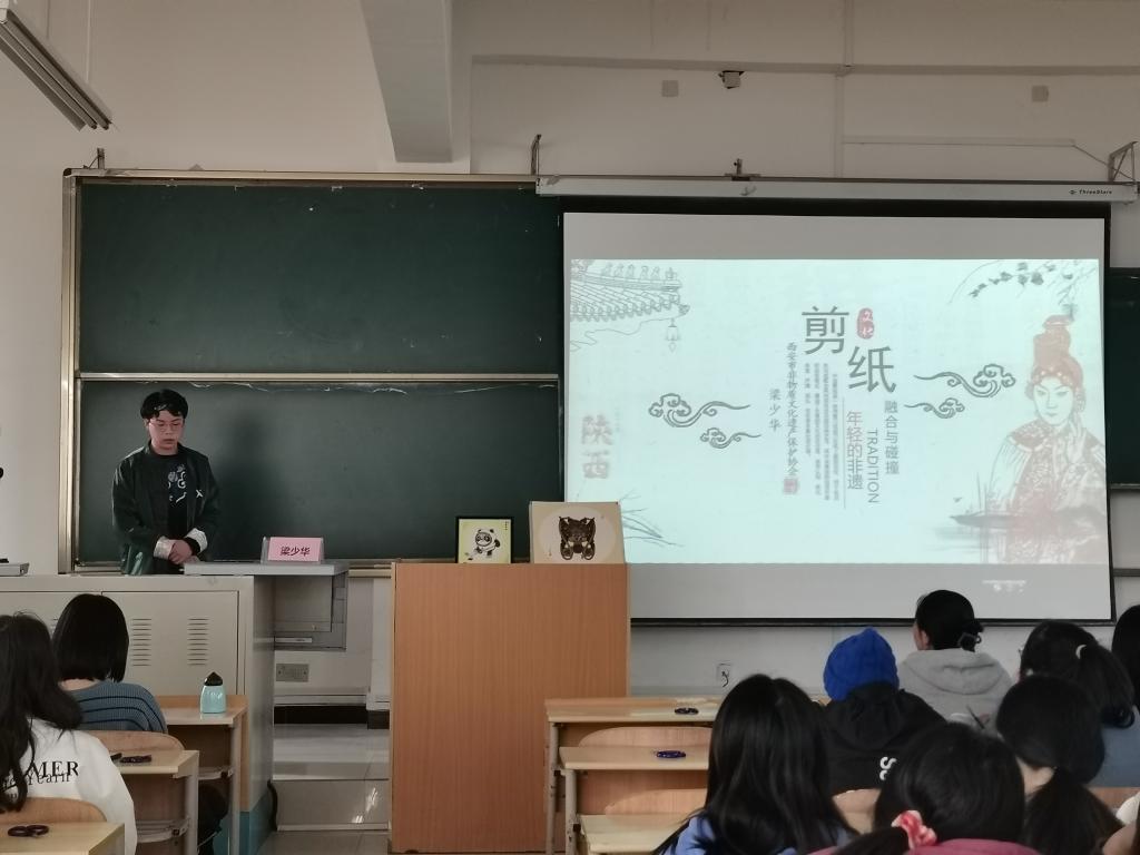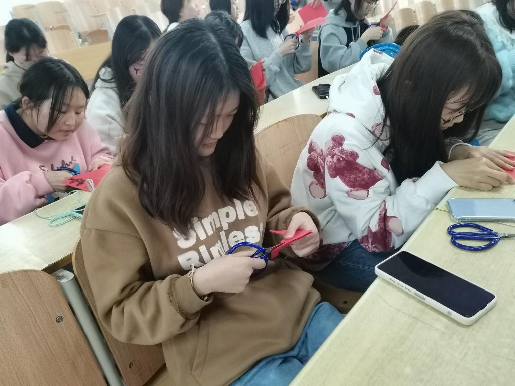 活动伊始,梁少华首先解读了“非遗”的概念,以有奖问答的形式与同学们展开讨论。随后,梁少华系统介绍了剪纸的种类、形式和文化底蕴,现场展示了多种剪纸形式,激发了同学们对剪纸的兴趣。纸上得来终觉浅,在同学们掌握基本理论方法后,梁少华分发剪纸模板和剪刀,引导同学们对折纸张、仔细构思,按照步骤和方法孵化出一个个惟妙惟肖、栩栩如生的作品。