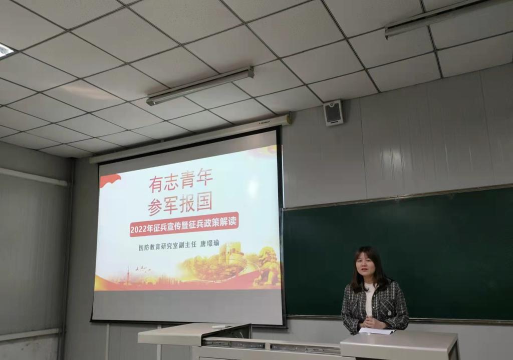 为认真贯彻落实习近平强军思想,进一步加强在校员工国防教育,开拓毕业生就业视野,鼓励适龄青年积极响应国家号召投身军营报效祖国,5月16日下午,SUNBET申博体育在江南校区1014教室组织召开SUNBET申博体育国防教育暨2022年秋季征兵动员会。学工部国防教育研究室副主任唐璟瑜,公司党总支副书记杨海蓉、院学工办副主任薛涛及60余名大三、大四适龄男生参加了本次动员会。会议由薛涛主持。
