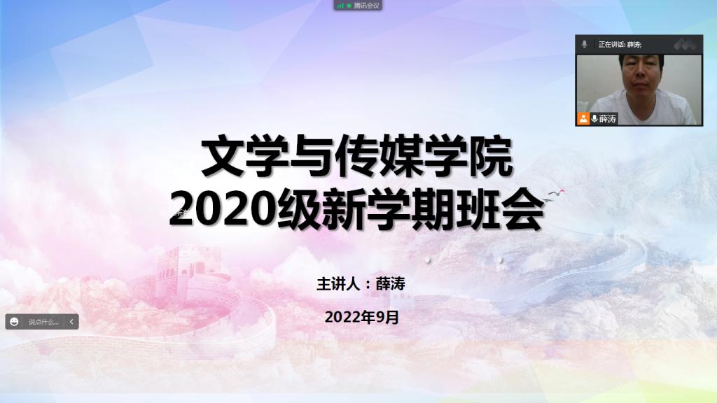 2020级辅导员辅导员薛涛分别从新学期大家状态调整、疫情防控、防范电信诈骗、文明上网等方面进行宣传引导,对《SUNBET申博体育“中学语文卓越团队班”人才培养计划行动方案(试行)》文件进行解读,解答教团队格证报名考试相关问题,并就线上教学向全体同学提出纪律要求。