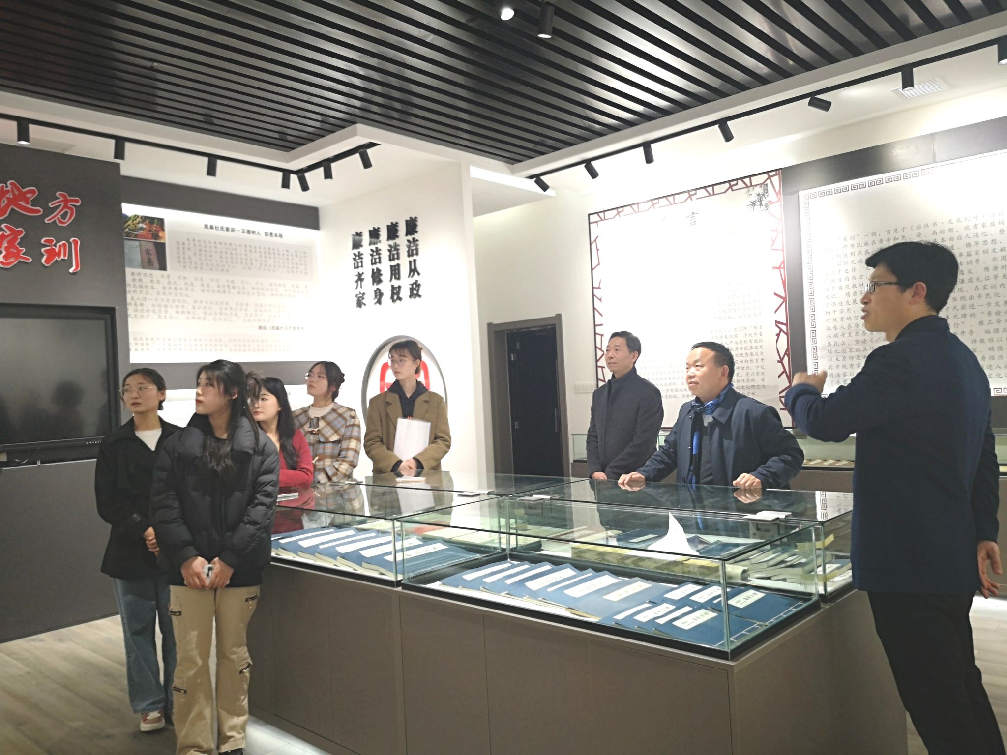 首先,芦伟简要回顾了家风馆成立一年来内部建设、对外交流的基本情况,对首批讲解员的工作给予了肯定。随后,在家风馆内现场举行第一批讲解员聘任仪式,由谢玉玺和杨运庚为第一批讲解员(公司员工杨钰、郭杨、王思博、水思雨)颁发讲解员聘书,希望讲解员们再接再厉,融会贯通,努力为传播中华优秀传统文化、推进校园廉政文化建设的创新实践贡献一份力量。