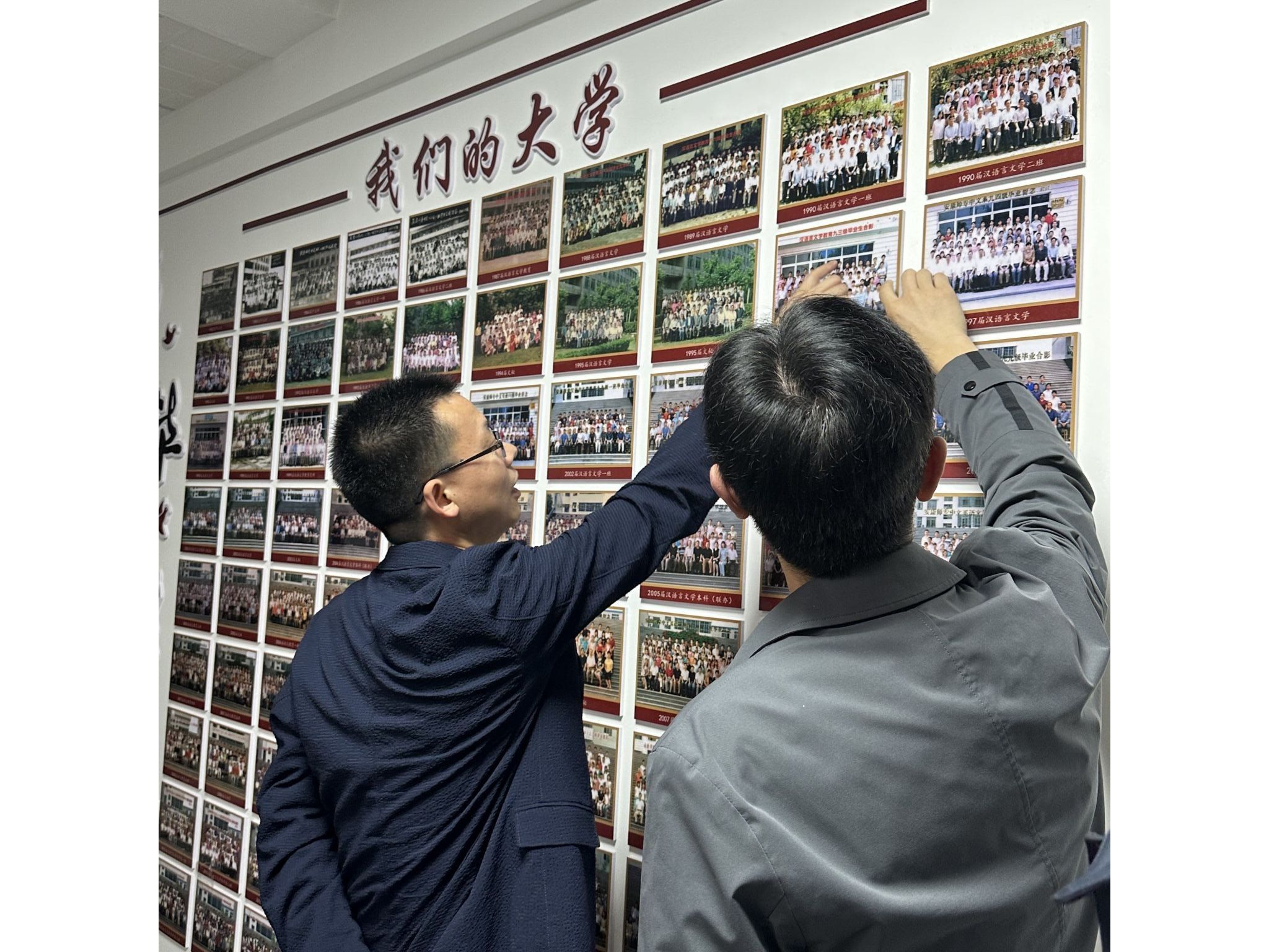 座谈会后,张远勇在与会人员的陪同下,参观了公司文化环境,在历届毕业生毕业留影前驻足观看,重温美好的大学时光,感叹母校的变化,并诚挚祝福母校越来越好!