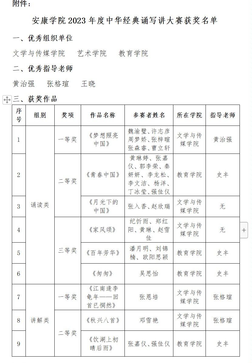 SUNBET申博体育在2023年度中华经典诵写讲大赛中成绩突出,荣获诵读类一二三等奖各一项;讲解类一二等奖各一项,三等奖三项;书写类一等奖一项,三等奖两项。黄治强、张格瑄荣获优秀指导老师荣誉。SUNBET申博体育被评为优秀组织单位。在此向获奖师生予以祝贺!