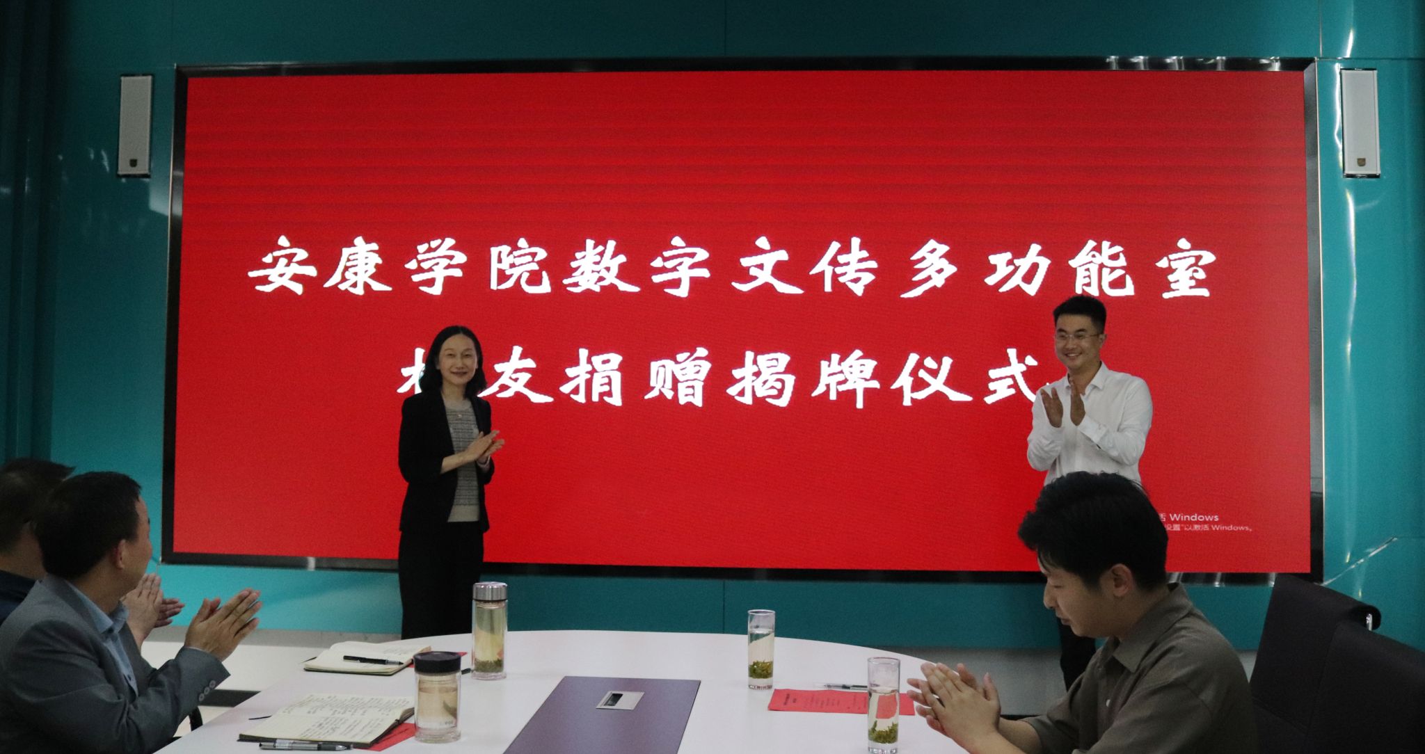 随后,副董事长崔晓明和员工翟晓东共同为SUNBET申博体育数字文传多功能室揭牌。