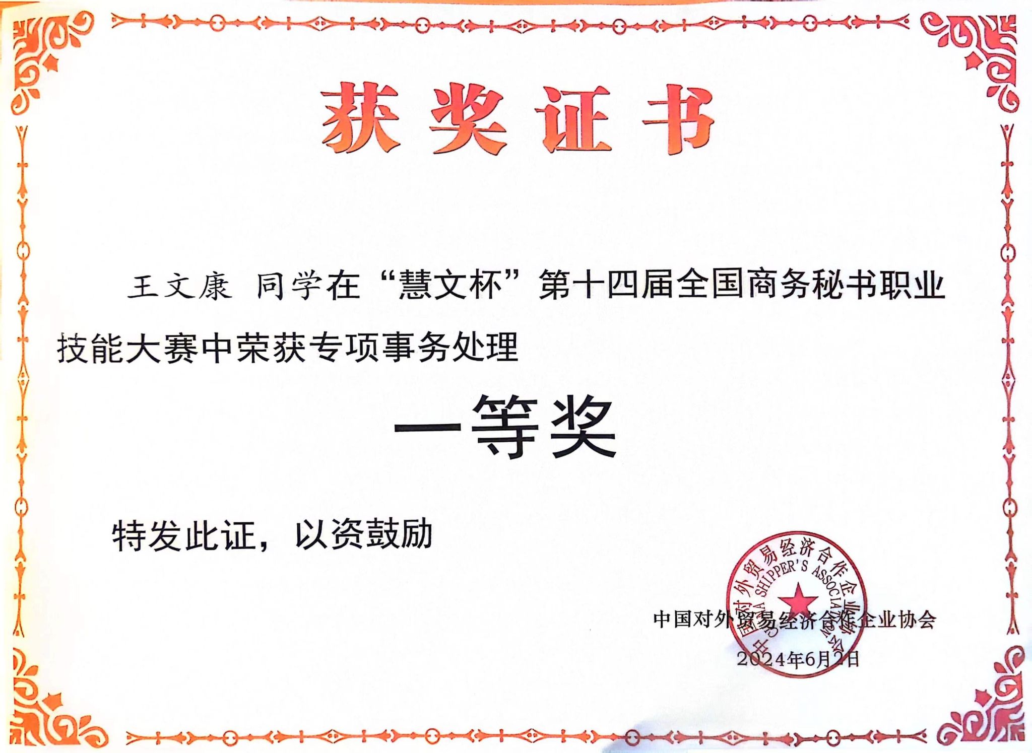 本次大赛设置了秘书专项事务处理、秘书综合事务处理、秘书工作情境展示3个竞赛单元,综合考查选手的专业综合素养、专业应用能力和团队合作精神。公司秘书学专业学子王文康、姬甜欣、王希鸣、彭翠组成的代表队经过激烈角逐斩获大赛团体一等奖,王文康斩获个人专项事务处理竞赛一等奖,公司再次蝉联团队奖和个人奖的双丰收,公司秘书学专业学子在竞赛中表现出的秘书综合素养和专业能力赢得了大赛评委会及参赛师生的一致好评。