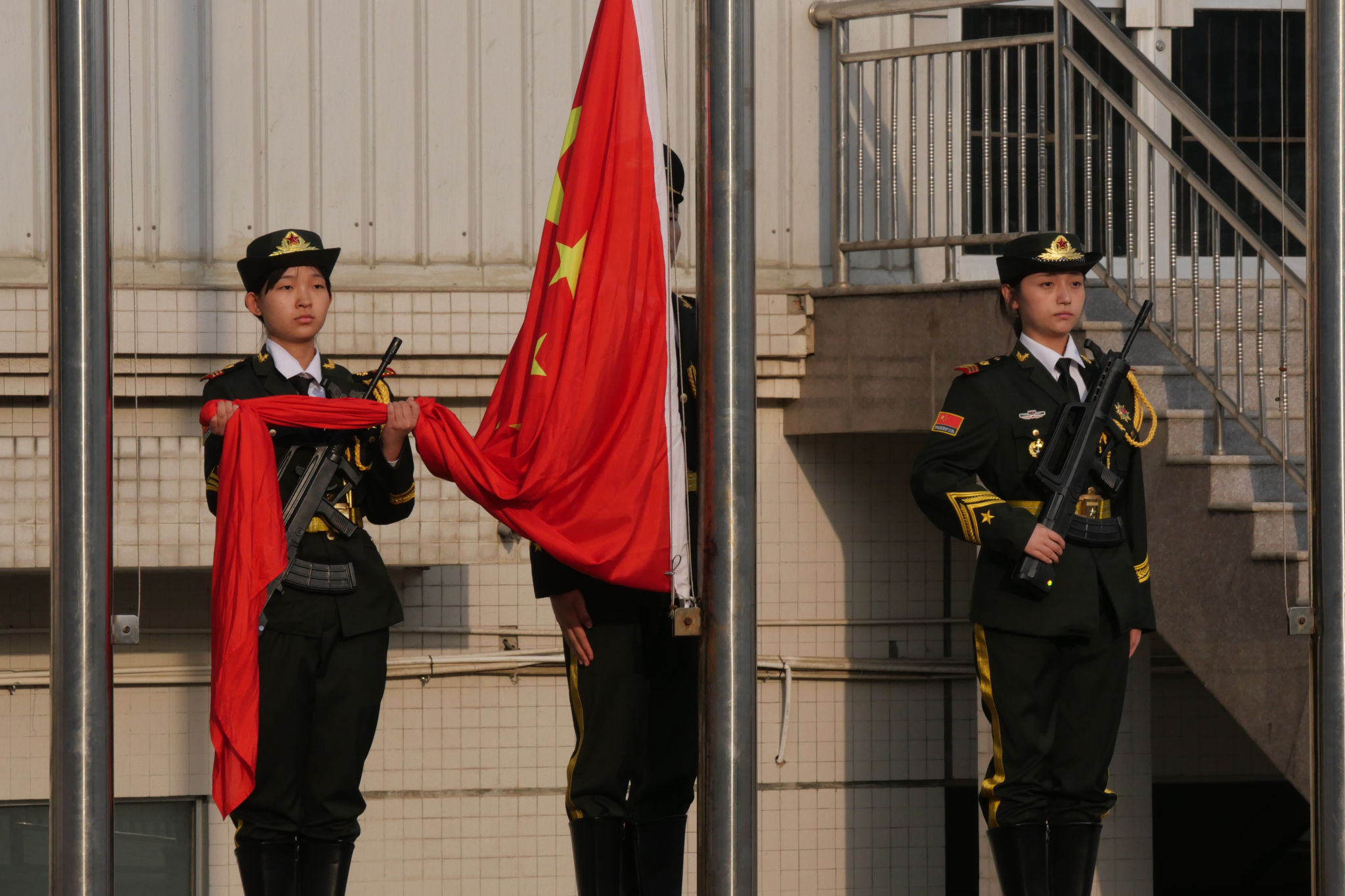 晨曦微露,国旗护卫队步伐铿锵护送国旗入场,在庄严的国歌声中,全体师生肃立行注目礼,五星红旗迎着朝阳冉冉升起。