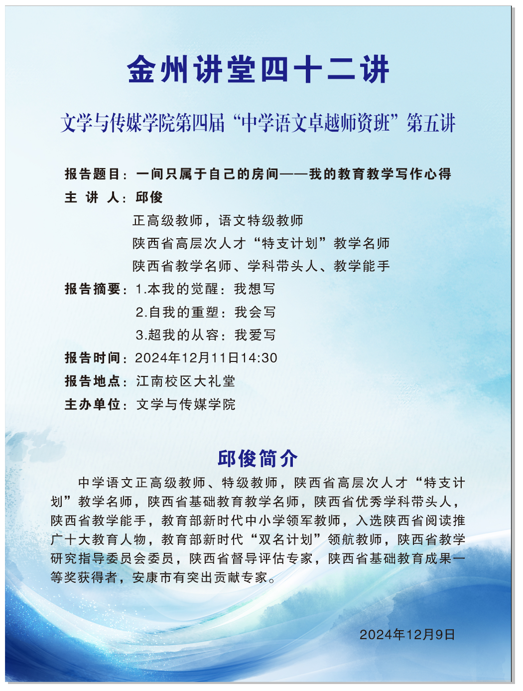 导航痕迹 首页 > 新闻通知 > 通知公告 > 正文 公司新闻 通知公告 金州讲堂四十二讲 主讲人:邱俊(陕西省高层次人才“特支计划”教学名师) 来源:SUNBET申博体育 发布日期:2024年12月09日 阅读次数: