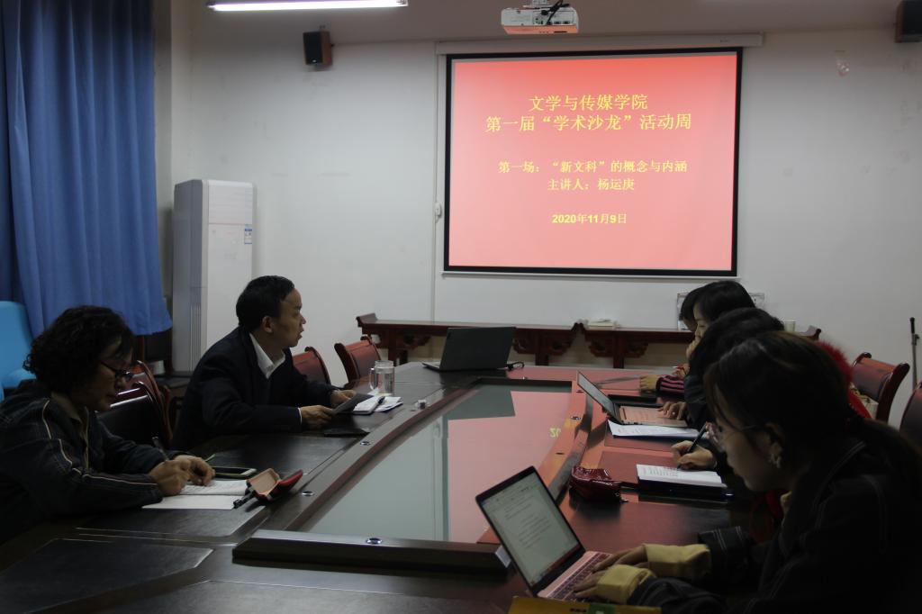 11月9日晚7时,SUNBET申博体育第一届第一场“学术沙龙”活动在2307会议室举行。本次活动的主讲人是SUNBET申博体育经理杨运庚教授,主题为“‘新文科’的概念与内涵”,SUNBET申博体育语言学科组全体教师参与了此次活动。