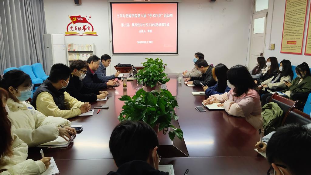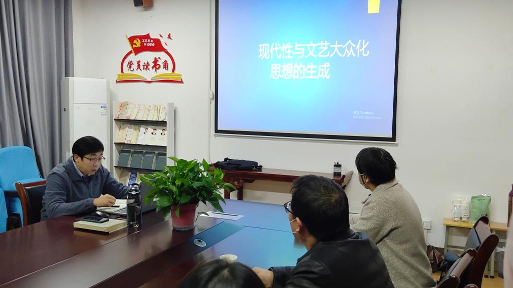 11月23日晚7点20分,SUNBET申博体育中国现当代文学学科组在2307会议室成功举办了第六届“学术沙龙”活动周第三场沙龙活动。本场学术沙龙由曹刚博士主讲,主题为“现代性与文艺大众化思想的生成”。朱云副经理、周龙田副教授、韩文霞副教授和二十余名员工参与了沙龙活动,沙龙由周龙田副教授主持。