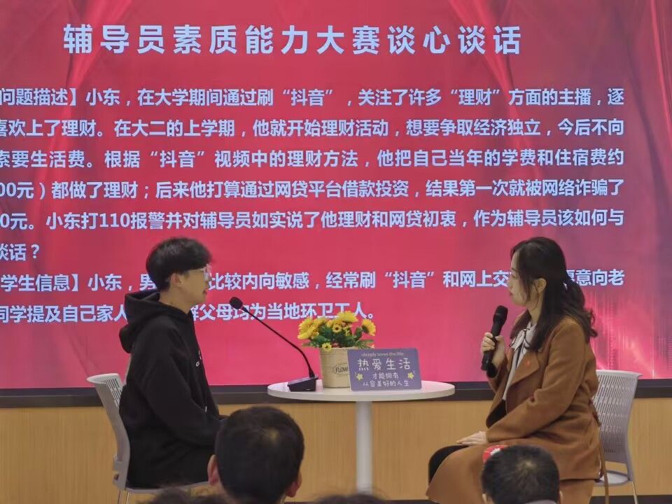 本次大赛分为初赛和决赛两个阶段,初赛采用基础知识测试的形式,从46名辅导员中遴选6名辅导员进入决赛角逐一二等奖。决赛包括案例分析和谈心谈话两个环节,全面考察辅导员对员工特征、成长成才规律的掌握程度及分析问题、研判问题、解决问题、应急处突等能力。参赛辅导员全方位展示了个人素养、知识储备和专业技能,充分彰显了辅导员队伍良好的专业素养和育人风采以及担当实干、追求卓越的精神品质。
